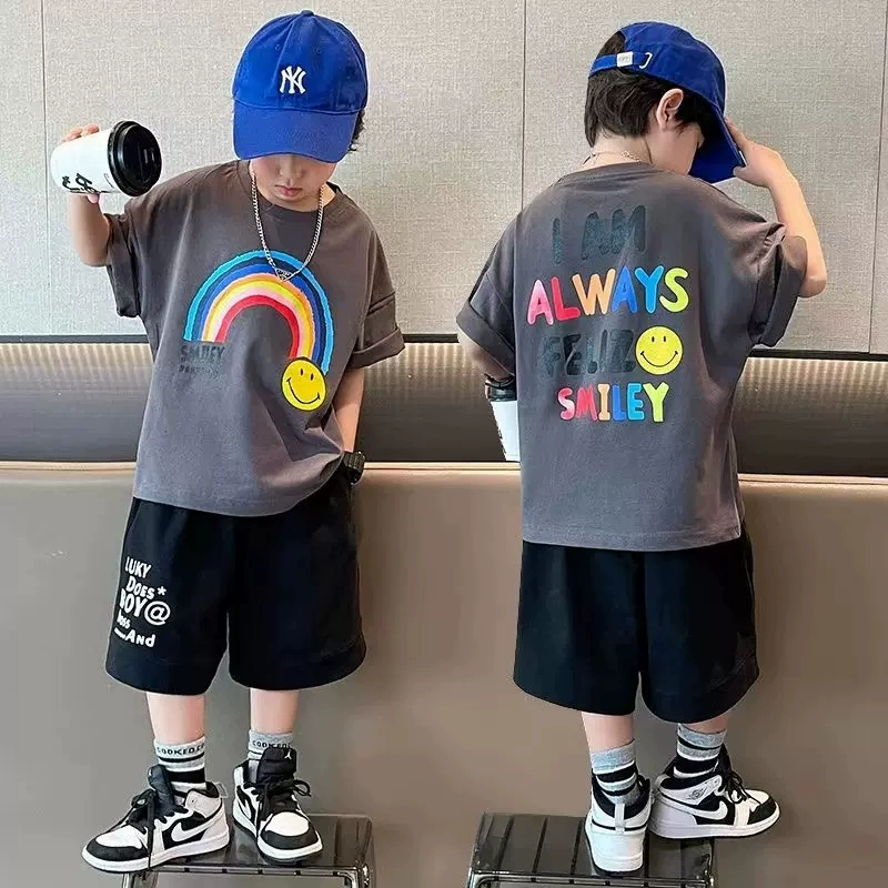 Pure cotton boys short-sleeved t-shirt pants suit summer 2024 medium and large children Korean style gray half-sleeved top