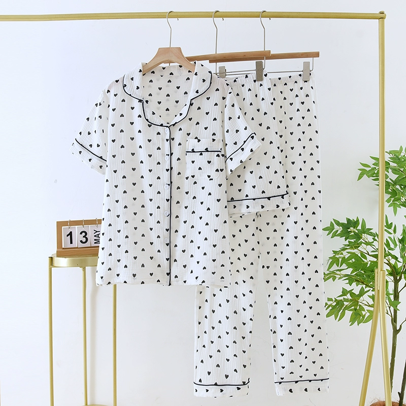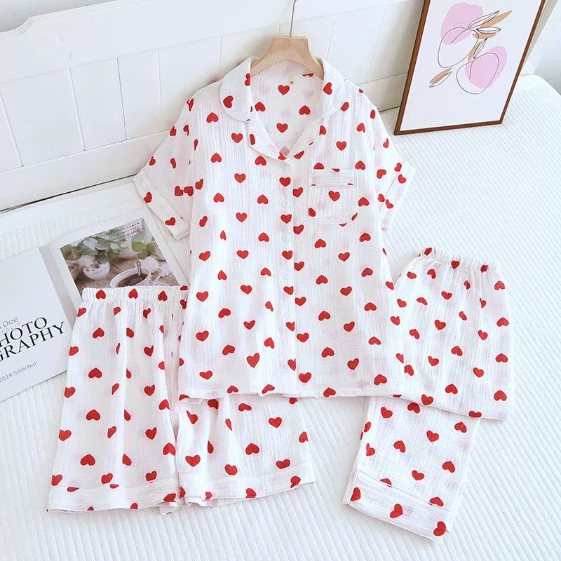 Pure cotton gauze sweet love pajamas women's short-sleeved trousers shorts casual spring and autumn crepe three-piece home clothes