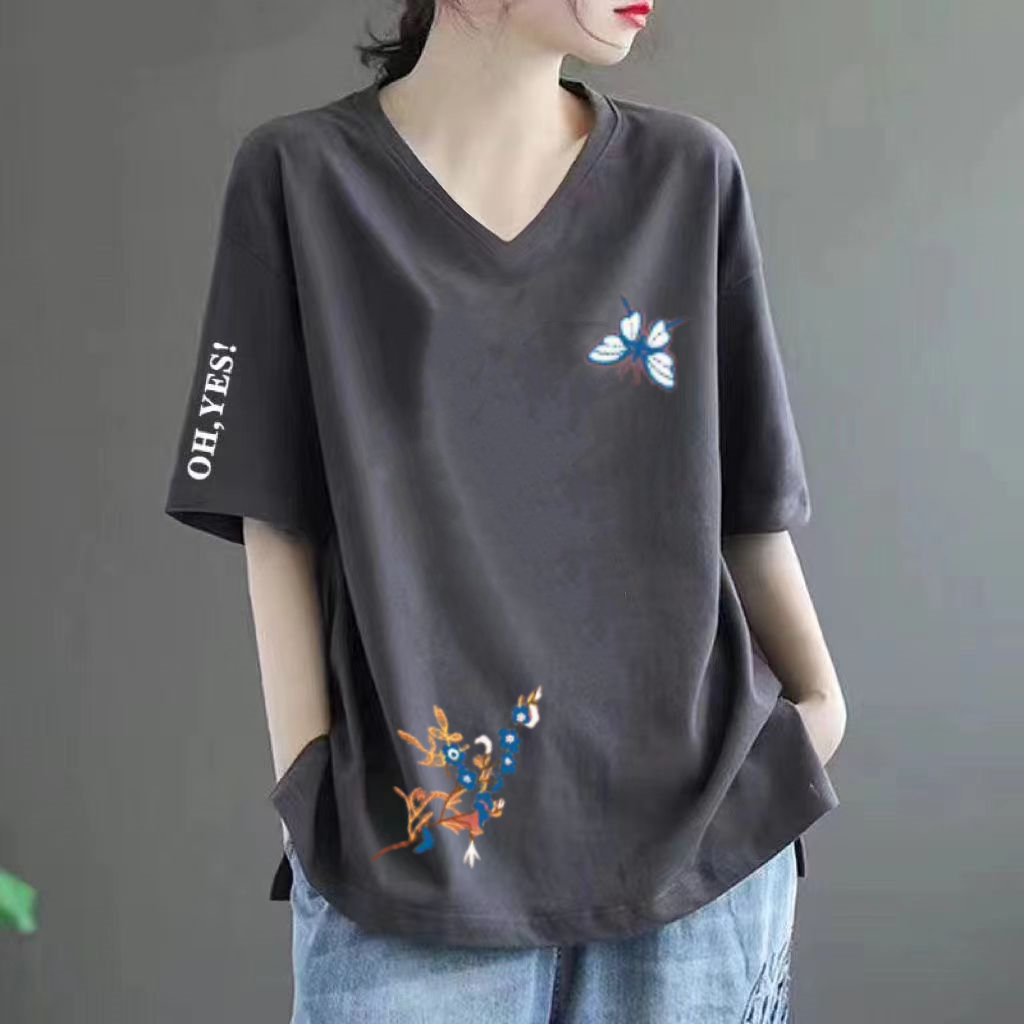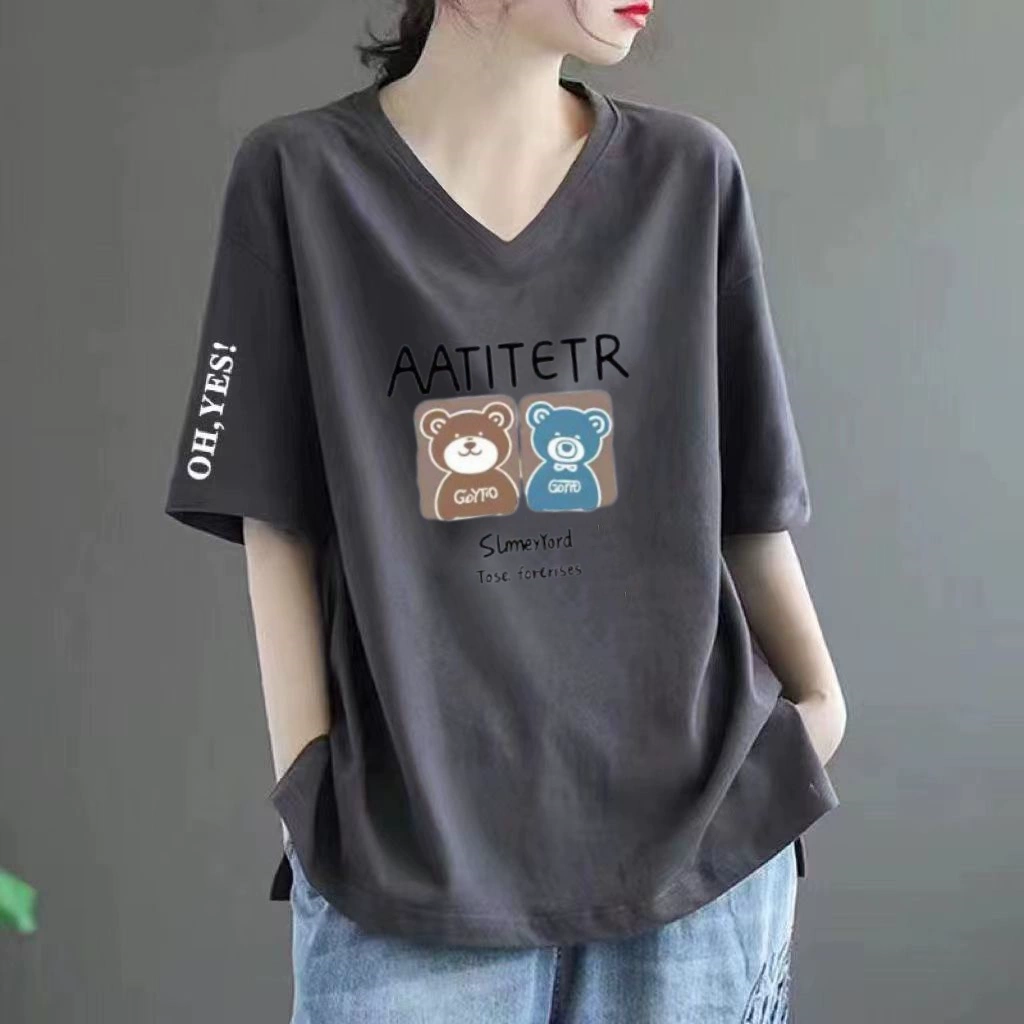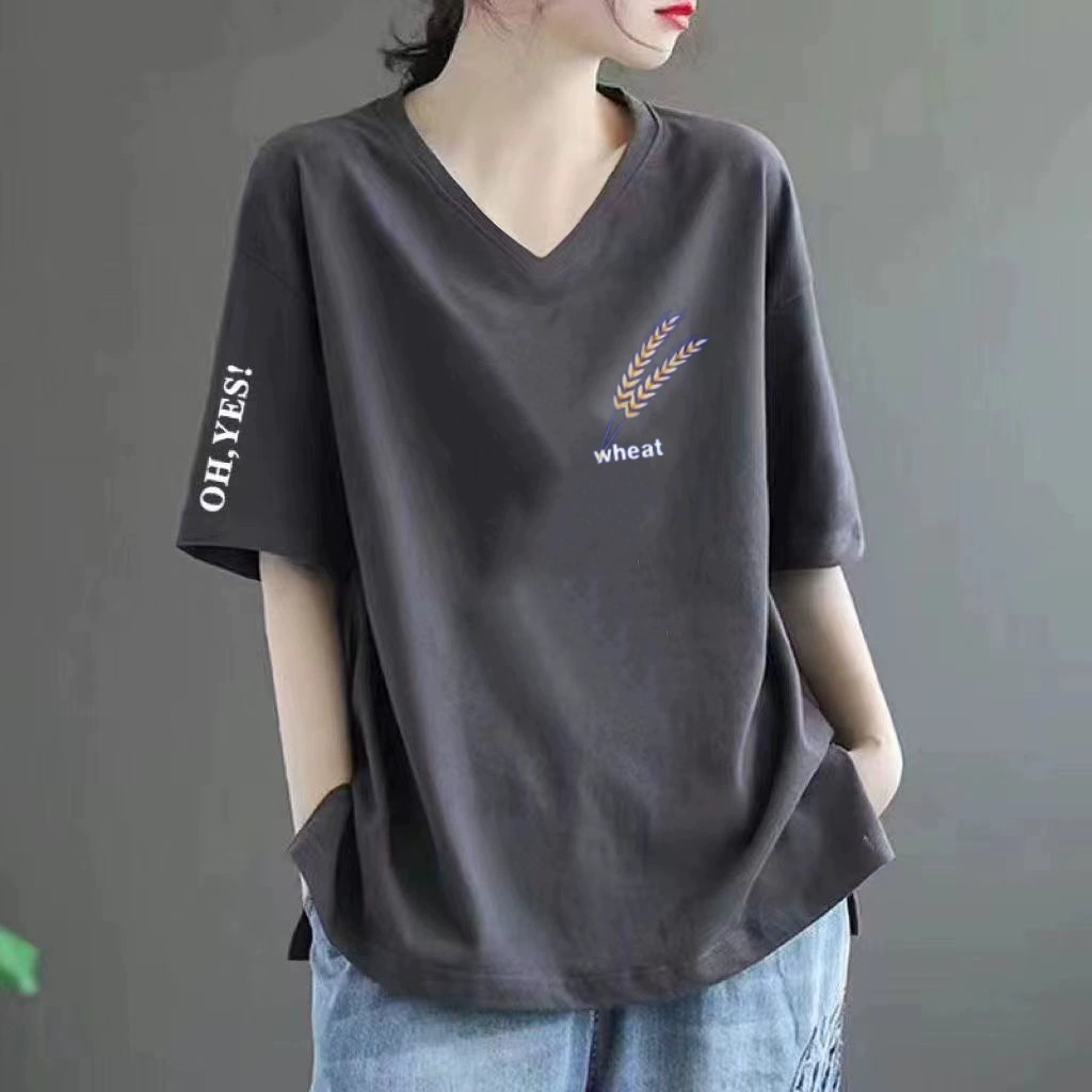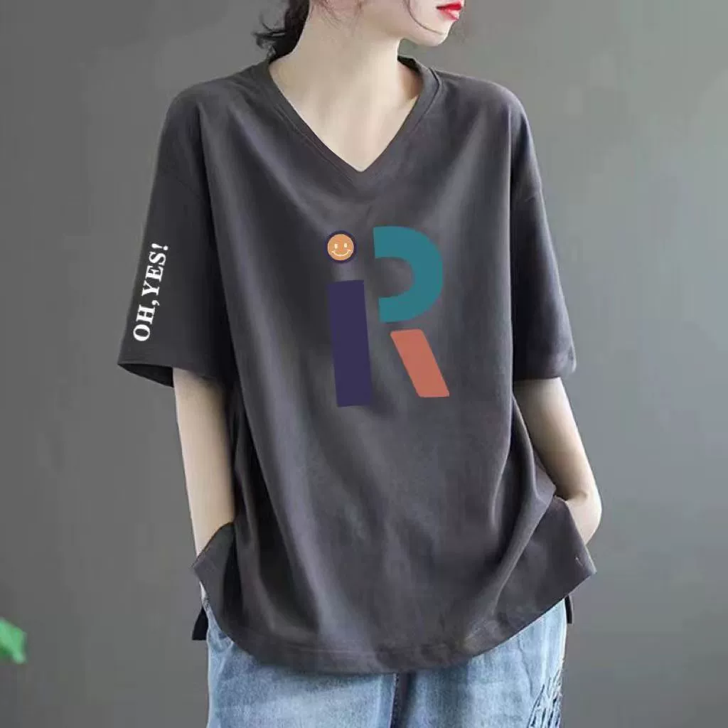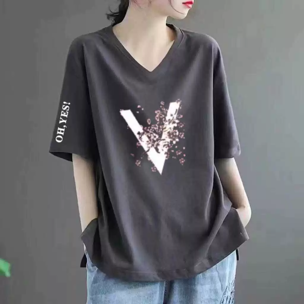 Pure cotton V -neck large size loose printed INS short -sleeved T -shirt