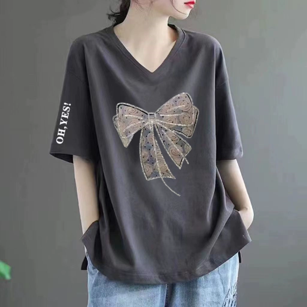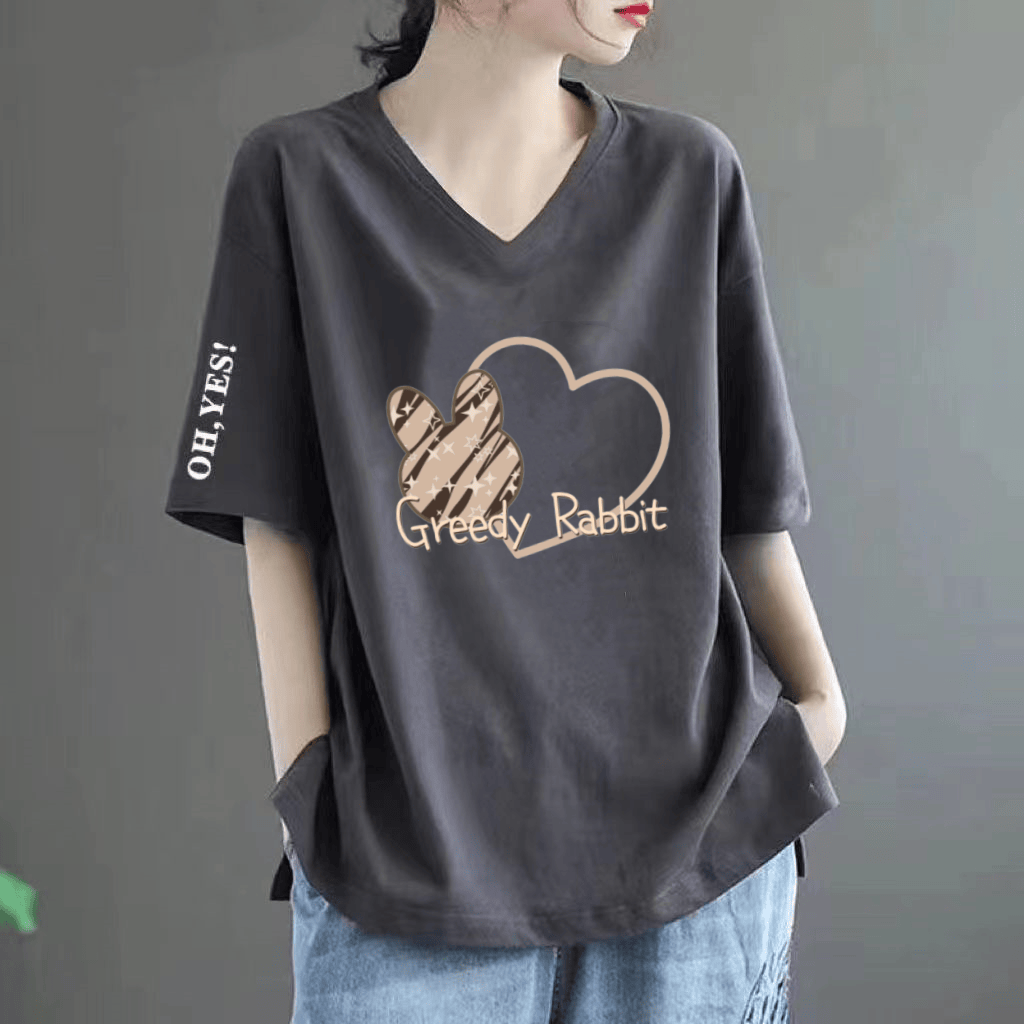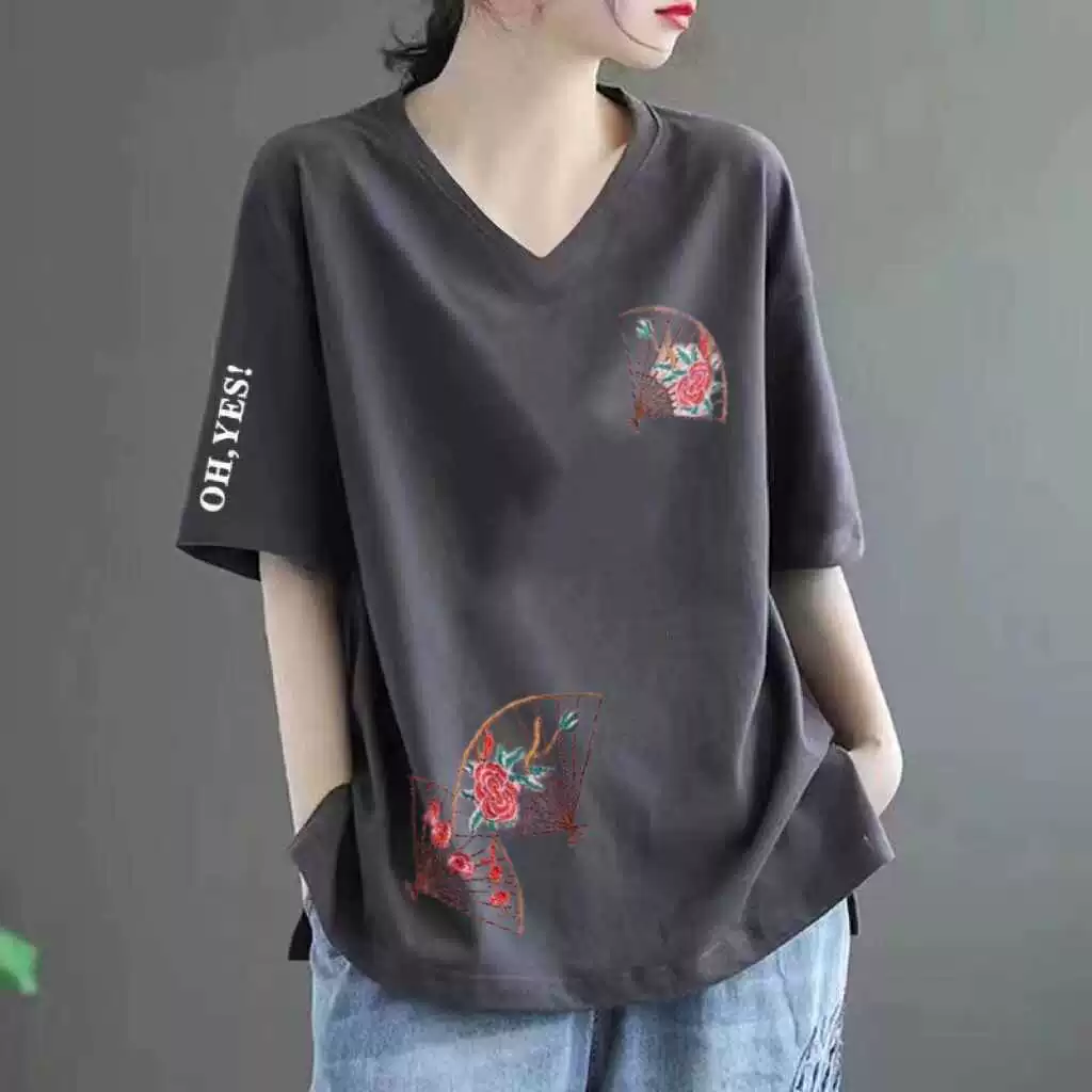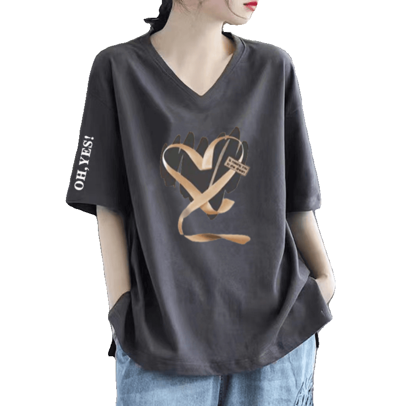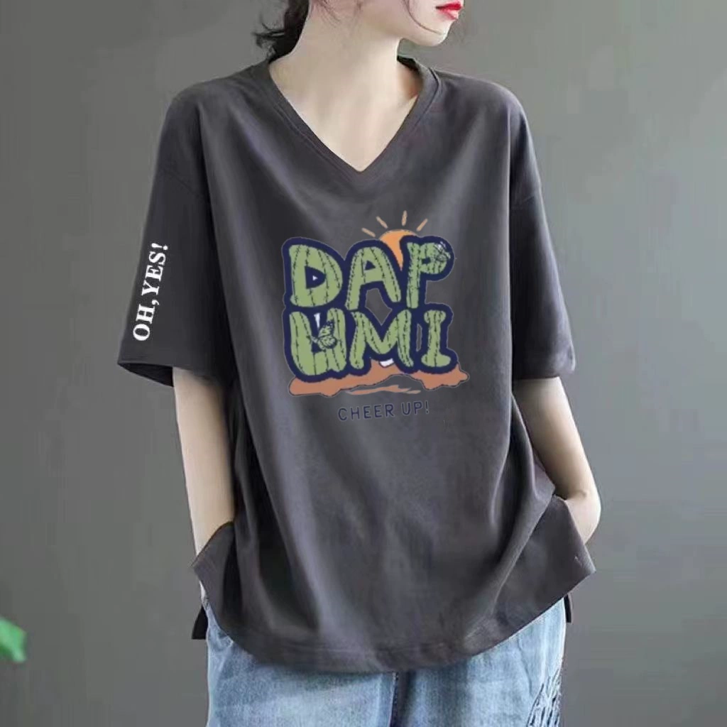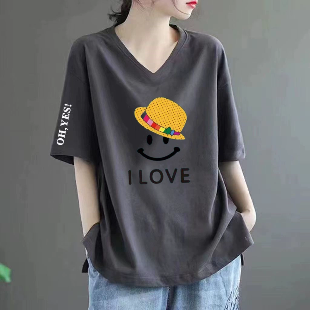 Pure cotton V -neck large size loose printed INS short -sleeved T -shirt