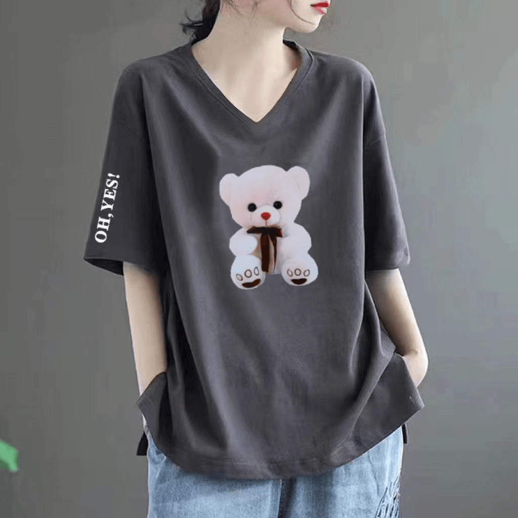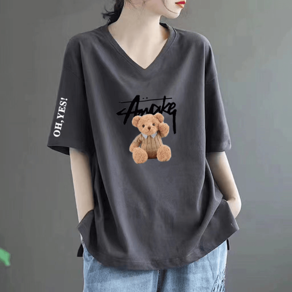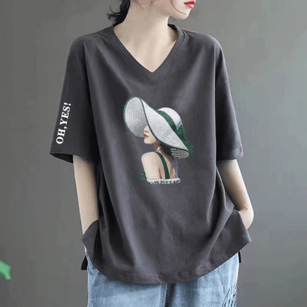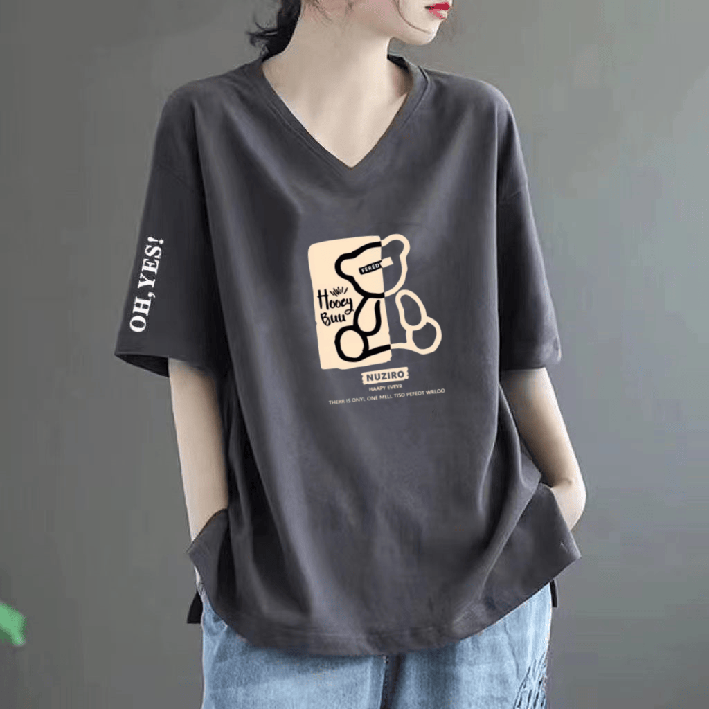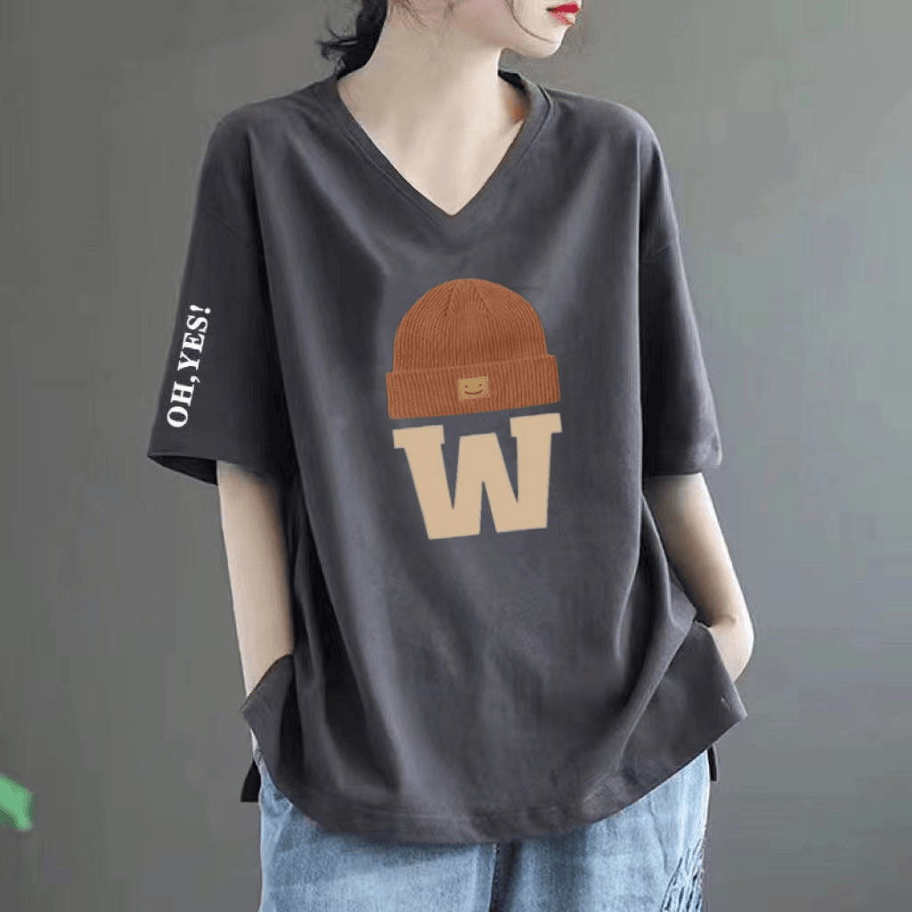 Pure cotton V -neck large size loose printed INS short -sleeved T -shirt