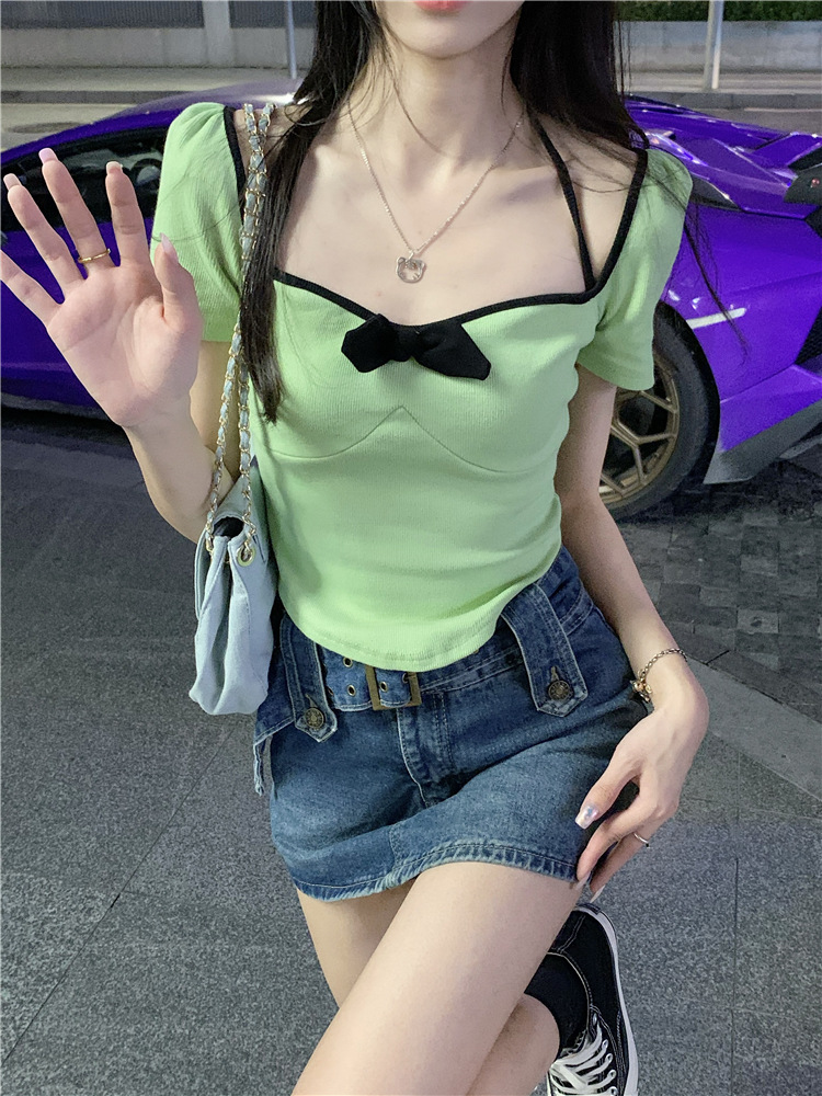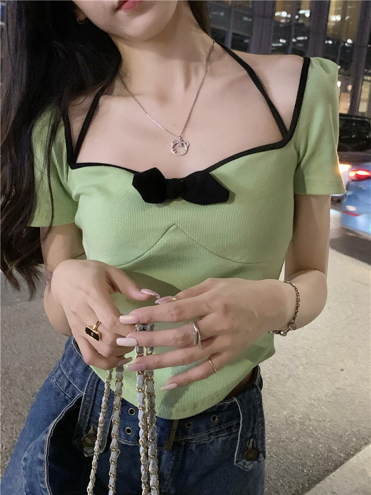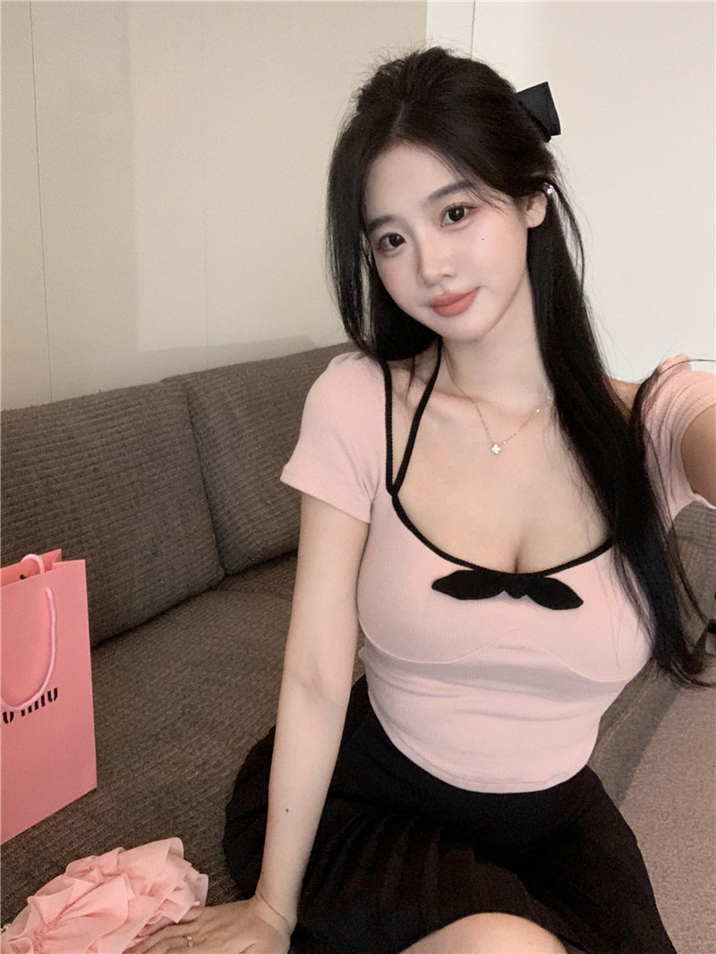 | nameOriginal | Pure Desire Bow U Neck Sexy Collarbone T-shirt Women's Summer Spice Girls Short-sleeved Top Short Low-cut Tight Base Shirt |