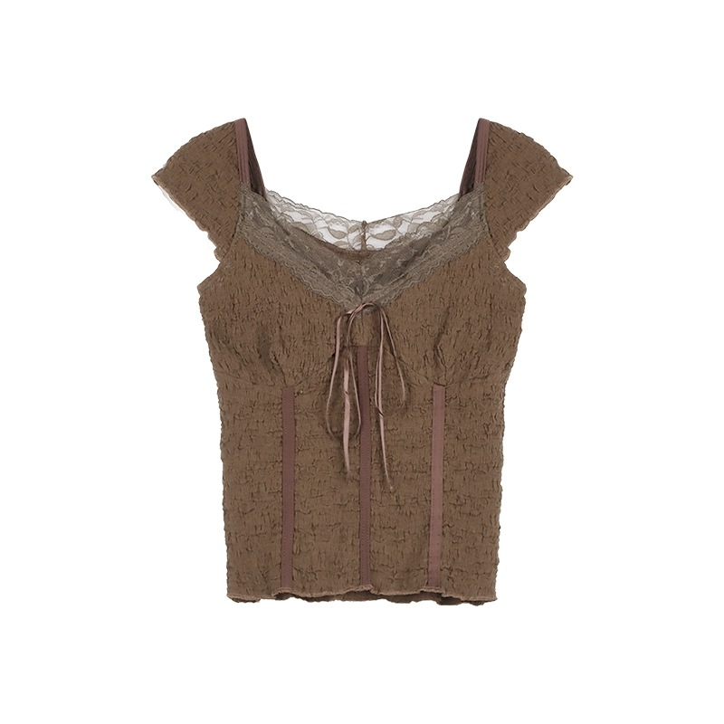 | nameOriginal | Pure desire gentle retro brown lace splicing short-sleeved T-shirt women's summer design niche slim short top |