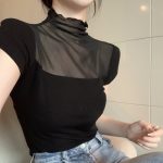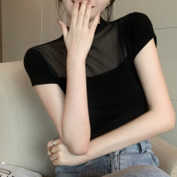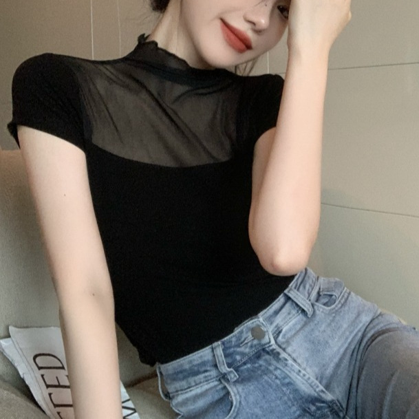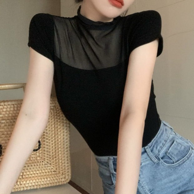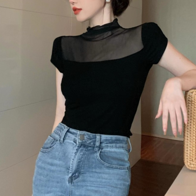 | nameOriginal | Pure Desire Hollow Lace Half-high Neck Slim-fit Top Women's Design Sense Niche Short-sleeved T-shirt for Summer |