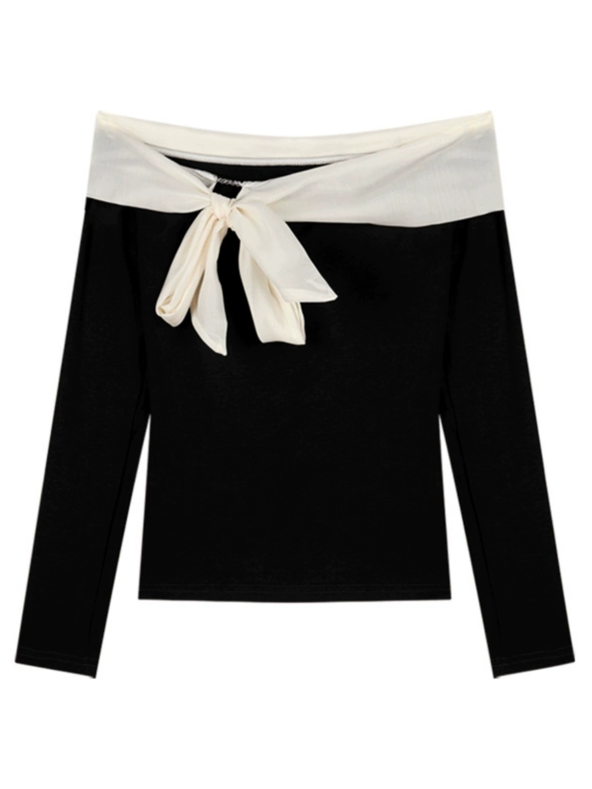 | nameOriginal | Pure desire one-shoulder bow long-sleeved T-shirt for women in spring and autumn slim-fitting short design contrasting color splicing top |