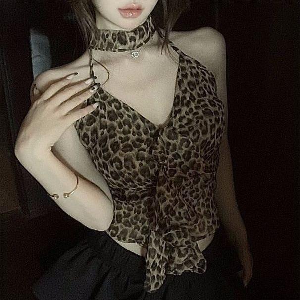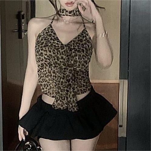| nameOriginal | Pure Desire Style Leopard Print Halter Sling Women's 2024 Summer Sexy Backless V-Neck Short Outer Wear Spice Girl Tight Vest |