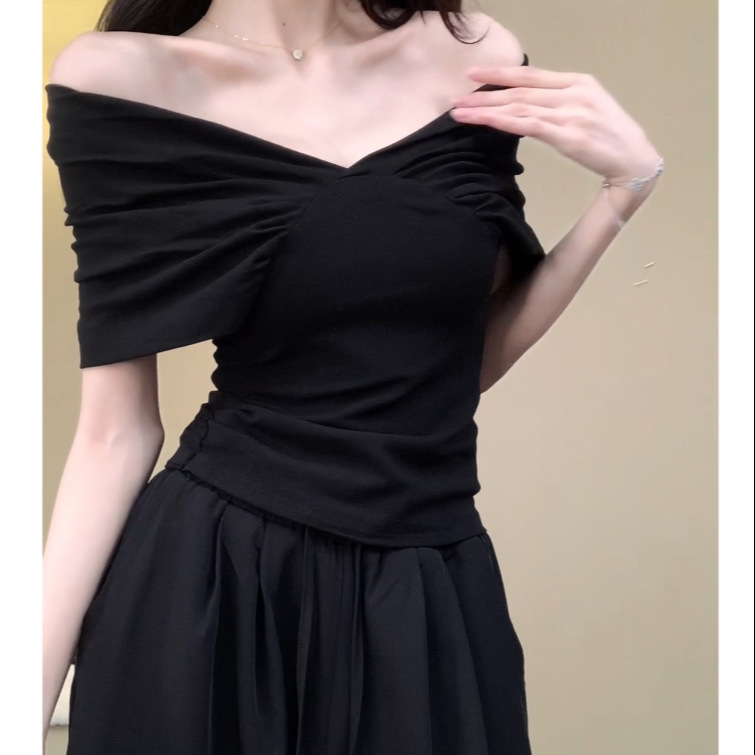 | nameOriginal | Pure Desire Style off-shoulder Short-sleeved Women's Temperament Slim-fit Shoulder-exposed Design Sense Niche Sexy Clavicle Black Two-wear T-shirt |