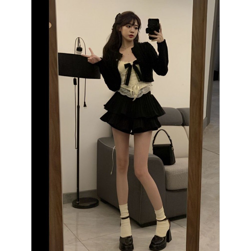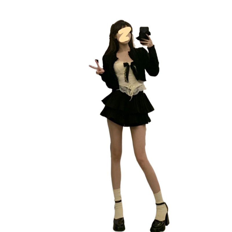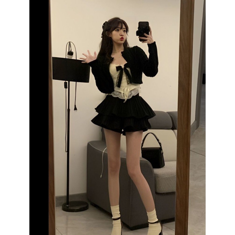 Pure Desire Style suit Women’s 2024 Spring New Short Cardigan Lace Sling Black miniskirt Pants Three-piece Set