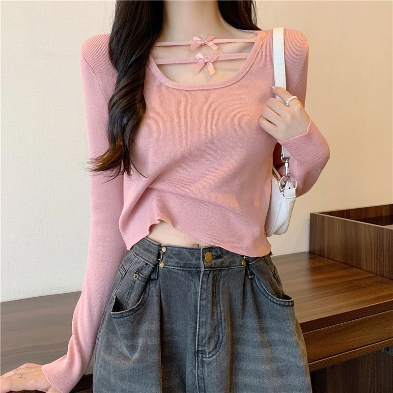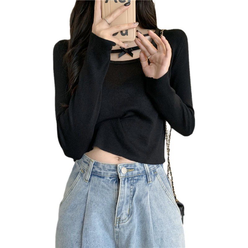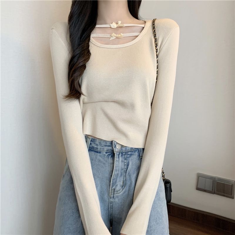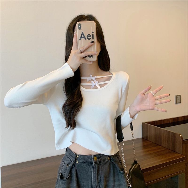 | nameOriginal | Pure desire style sweet bow short white T-shirt women's early autumn ins hot girl slim slimming long sleeve inner top |