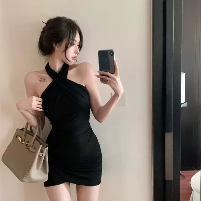 Pure sexy hot girl style off-shoulder cross-hate neck dress small feminine tight hip-pack short skirt women summer