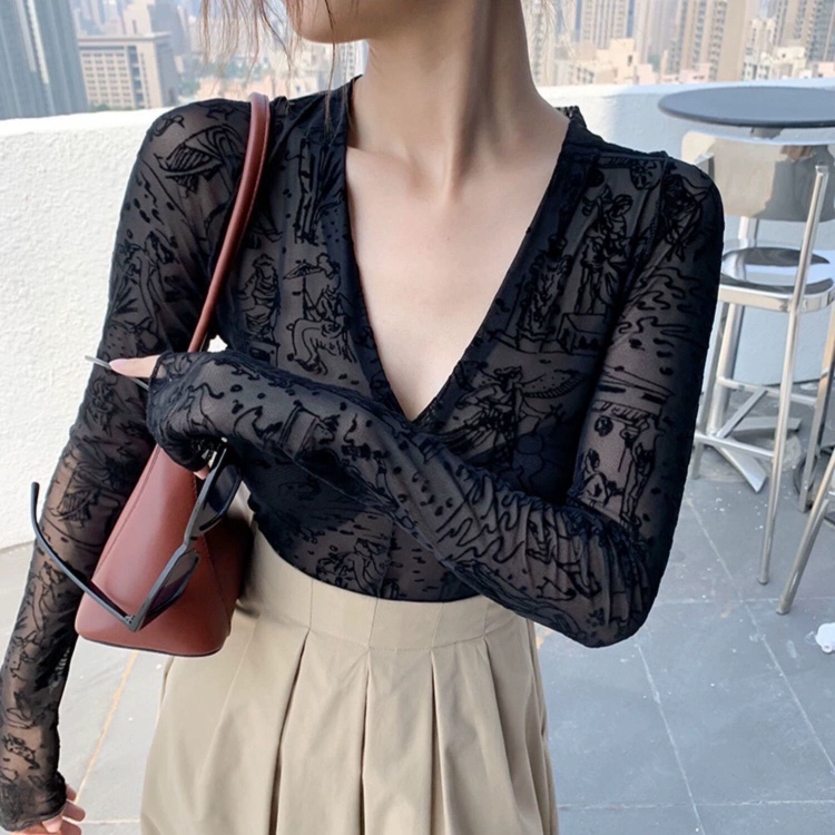 Pure lust sexy v-neck flocked mesh long-sleeved T-shirt design niche short top with bottoming shirt for women in early spring