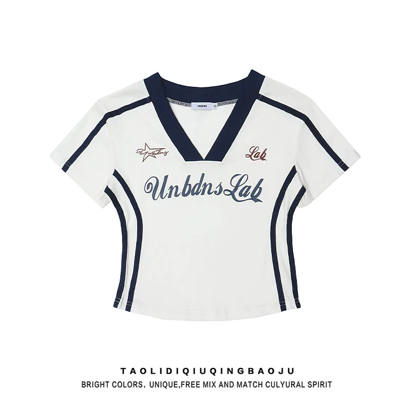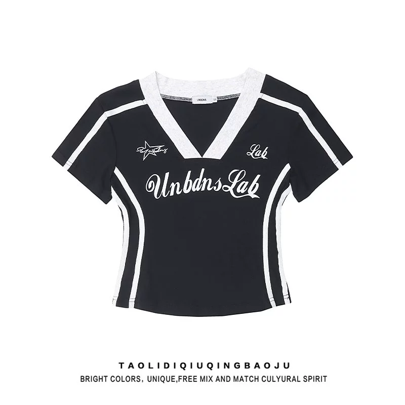 | nameOriginal | Pure lust style abg hot girl splicing V-neck right shoulder short-sleeved T-shirt women's summer slimming waist jazz sweet and spicy short top |