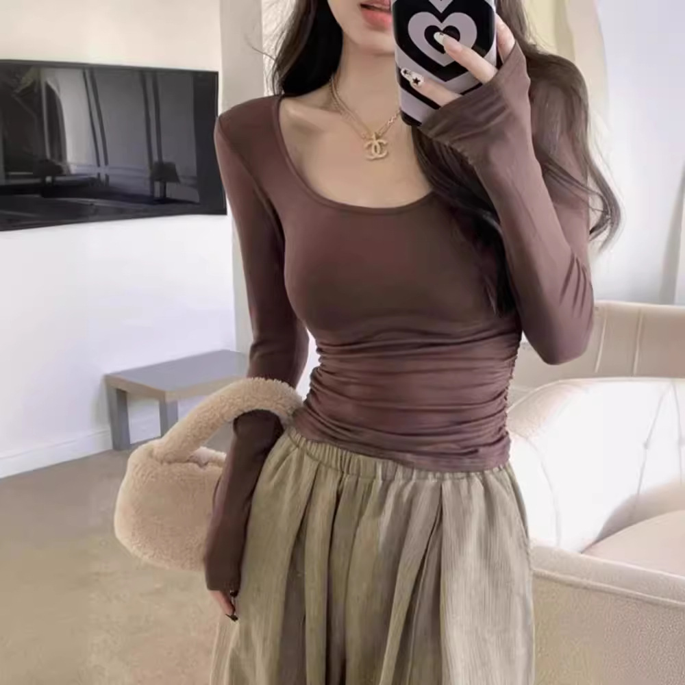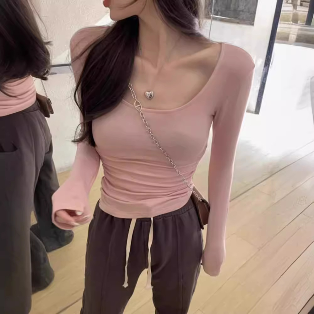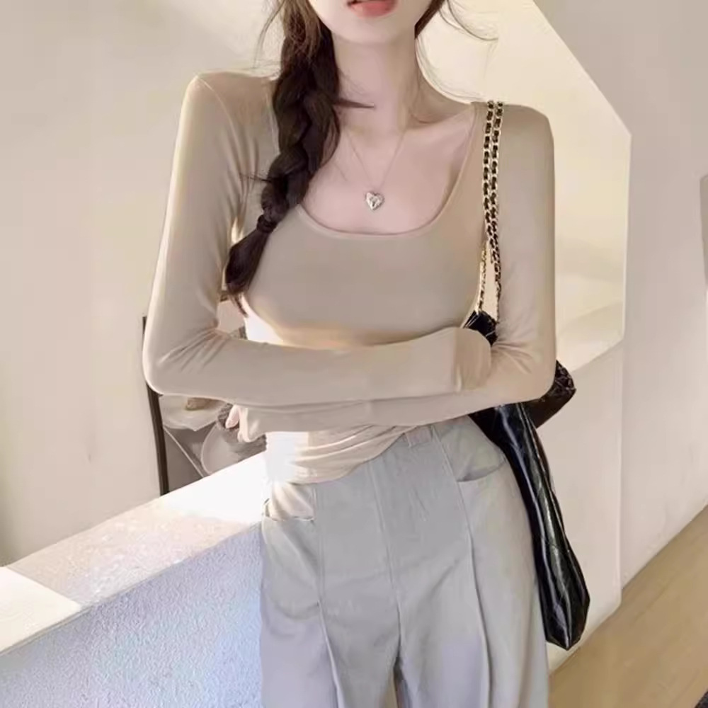 Pure Sexy Collarbone Tight U-neck Base Shirt Women’s Spring Season New Inner Short Top Slim Long-sleeved T-shirt