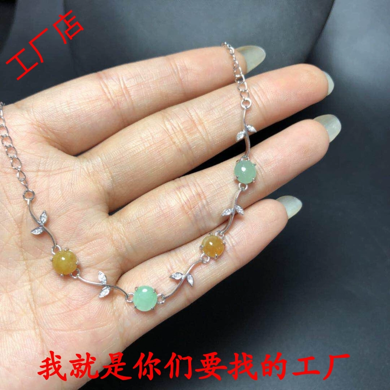 Pure silver electroplating, simple and fresh leaf style, empty support bracelet inlaid with 4 jadeite gemstones in a circle of 6 x 6mm