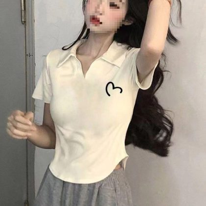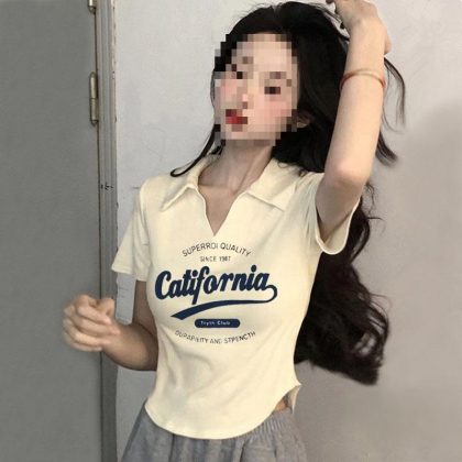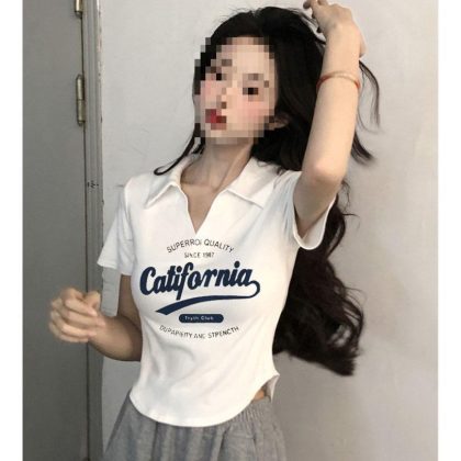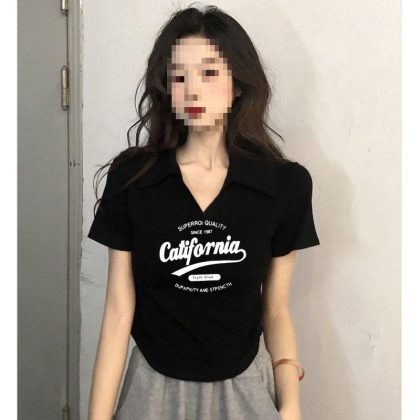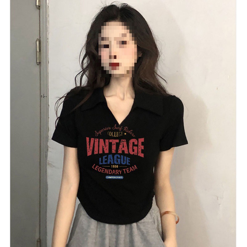 nameOriginal | Pure Spice Girl Slim-fit Top Design Sense 2024 New American Polo Shoulder Short-sleeved V-neck T-shirt Women's Summer |