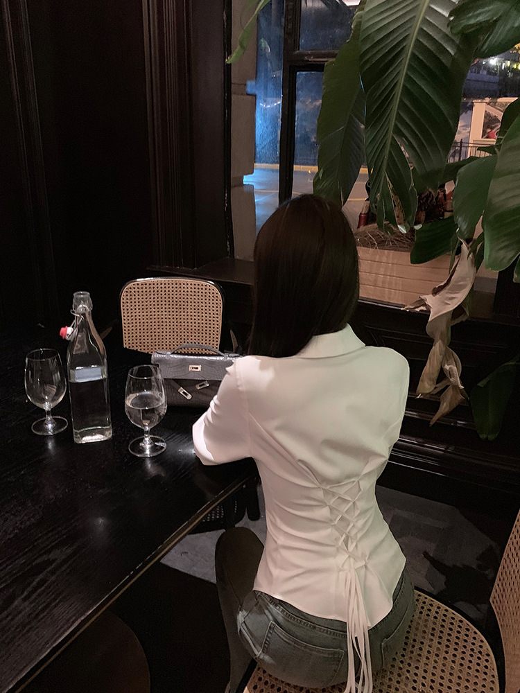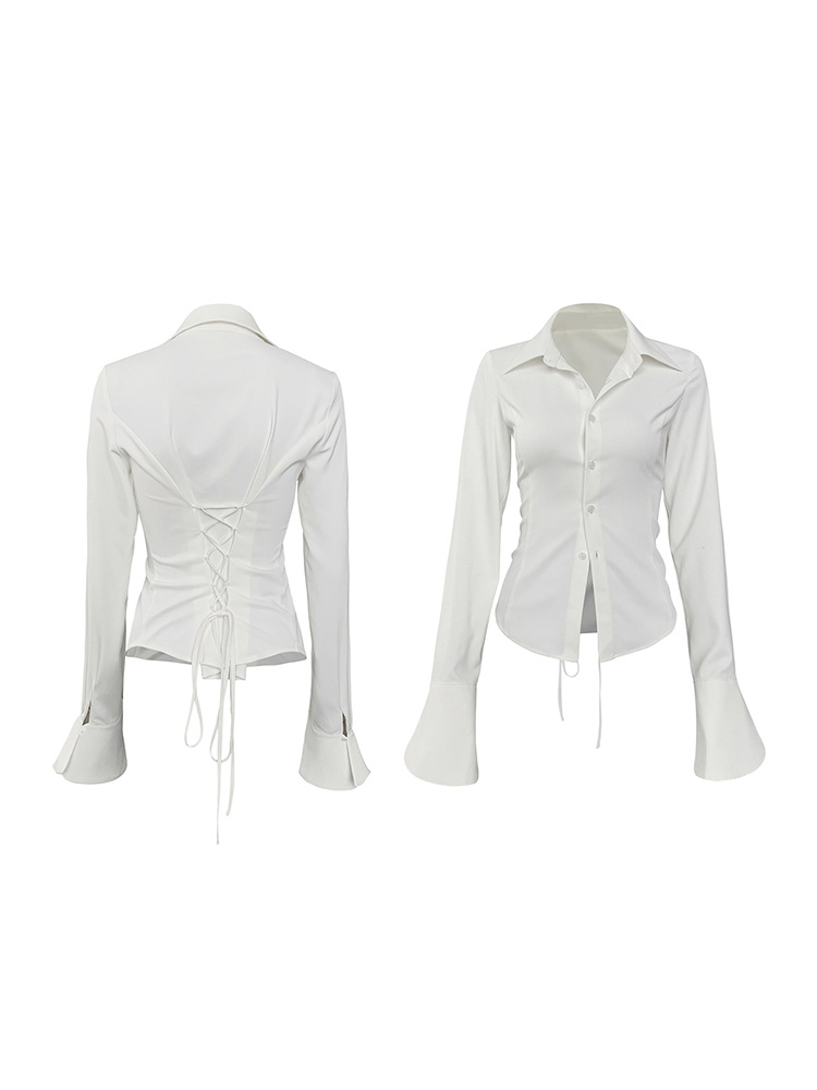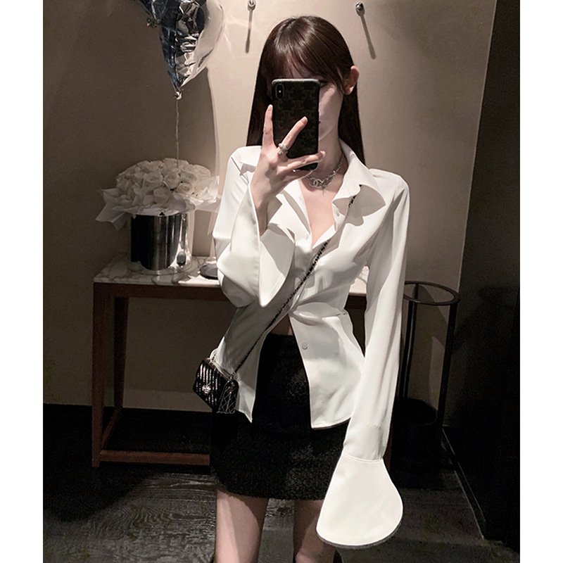 | nameOriginal | Pure white V-neck flared long-sleeved shirt Women's Spring and Autumn design sense niche waist tight shirt slim top |