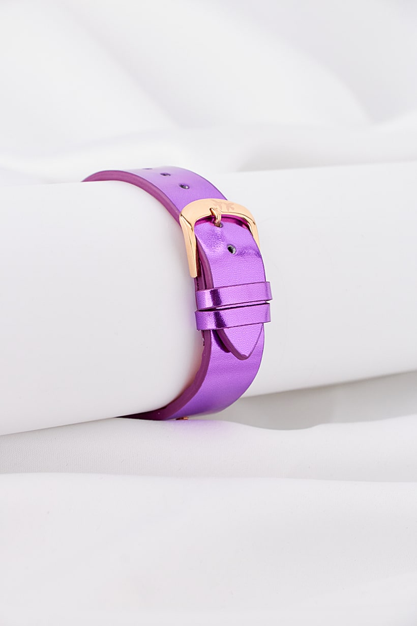 This product features a round dial with a glass window and marker display. It is an ideal gift for women and has a purple synthetic leather strap with a buckle closure. The watch is analog and has a purple dial, making it a great addition to any purple-themed collection.