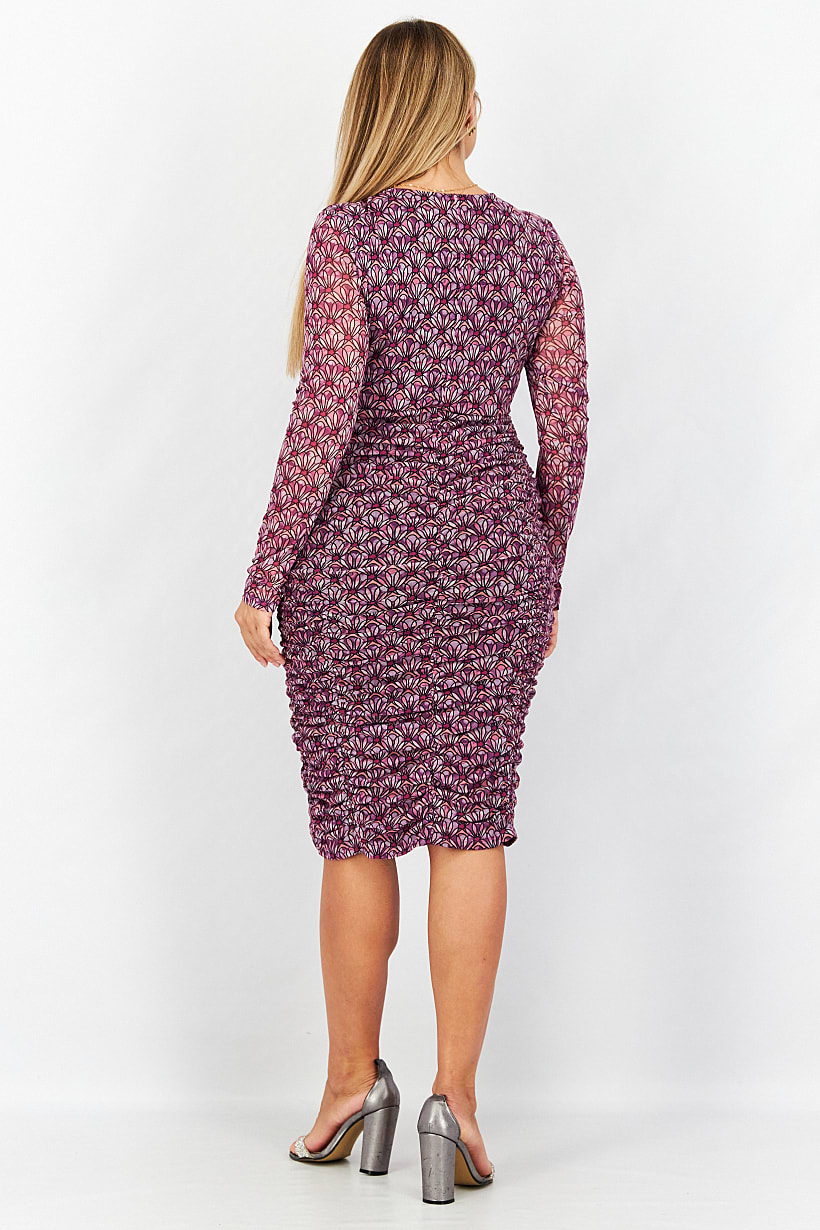 Care : Machine washable, Dress Style : Bodycon, Fit : Regular fit, Size shown : International, Types of Hem : Straight hem, Types of Neckline & Collar : V-neckline, Types of Sleeve : Longsleeve, Fabrics : 95% Polyester, 5% Elastane, Occasion : Casual, Pattern & Print : Allover print, Types of Closures : Pullover, Color Family : Purple,