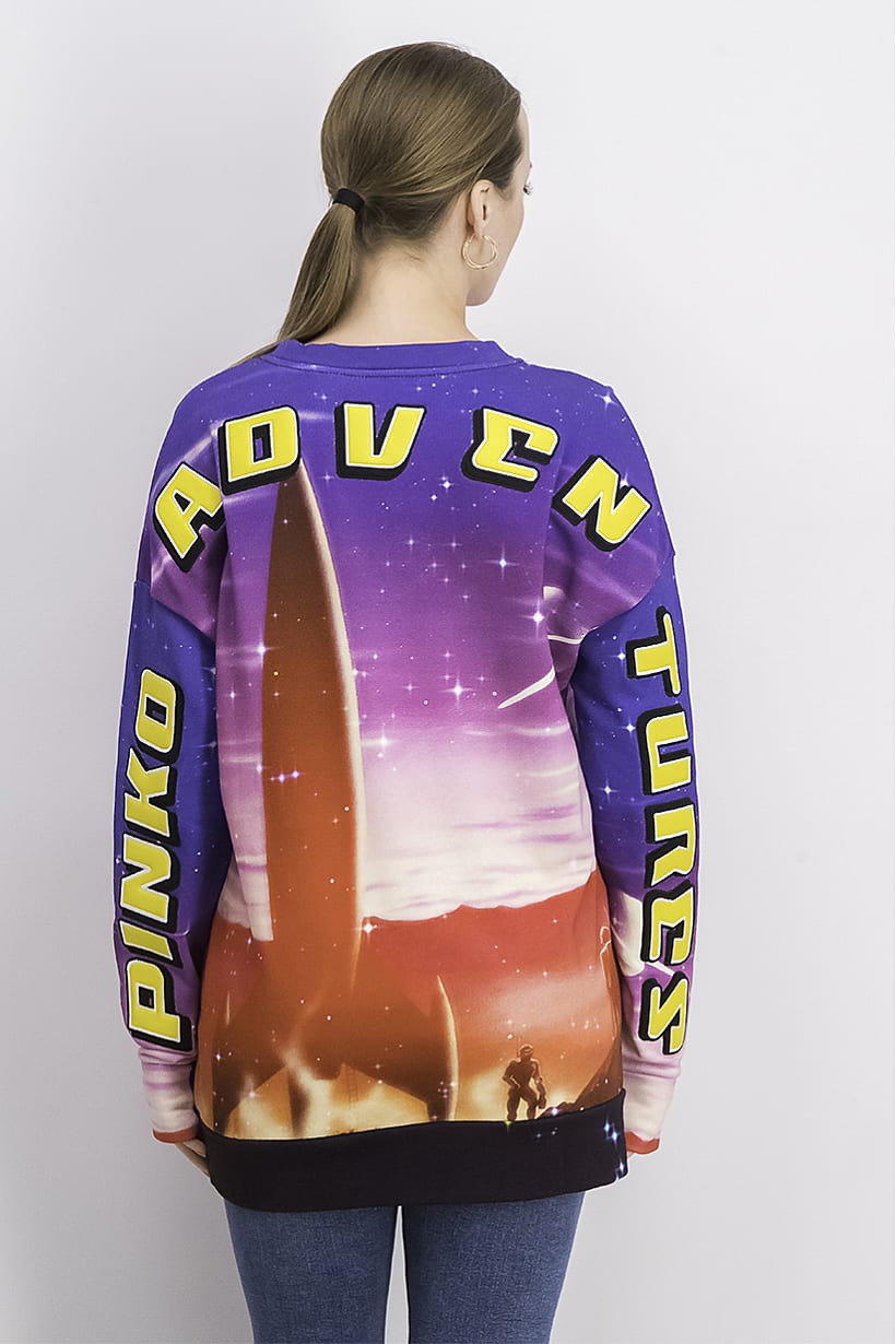 This product is easy to care for as it is machine washable. The size displayed is in international sizing and it features a medium thickness with long sleeves and a crew neckline. The fabric is made of 100% cotton and has a graphic print. It is a pullover style with a purple color scheme, making it an ideal choice for women.