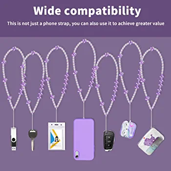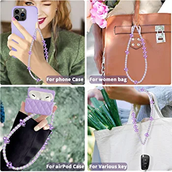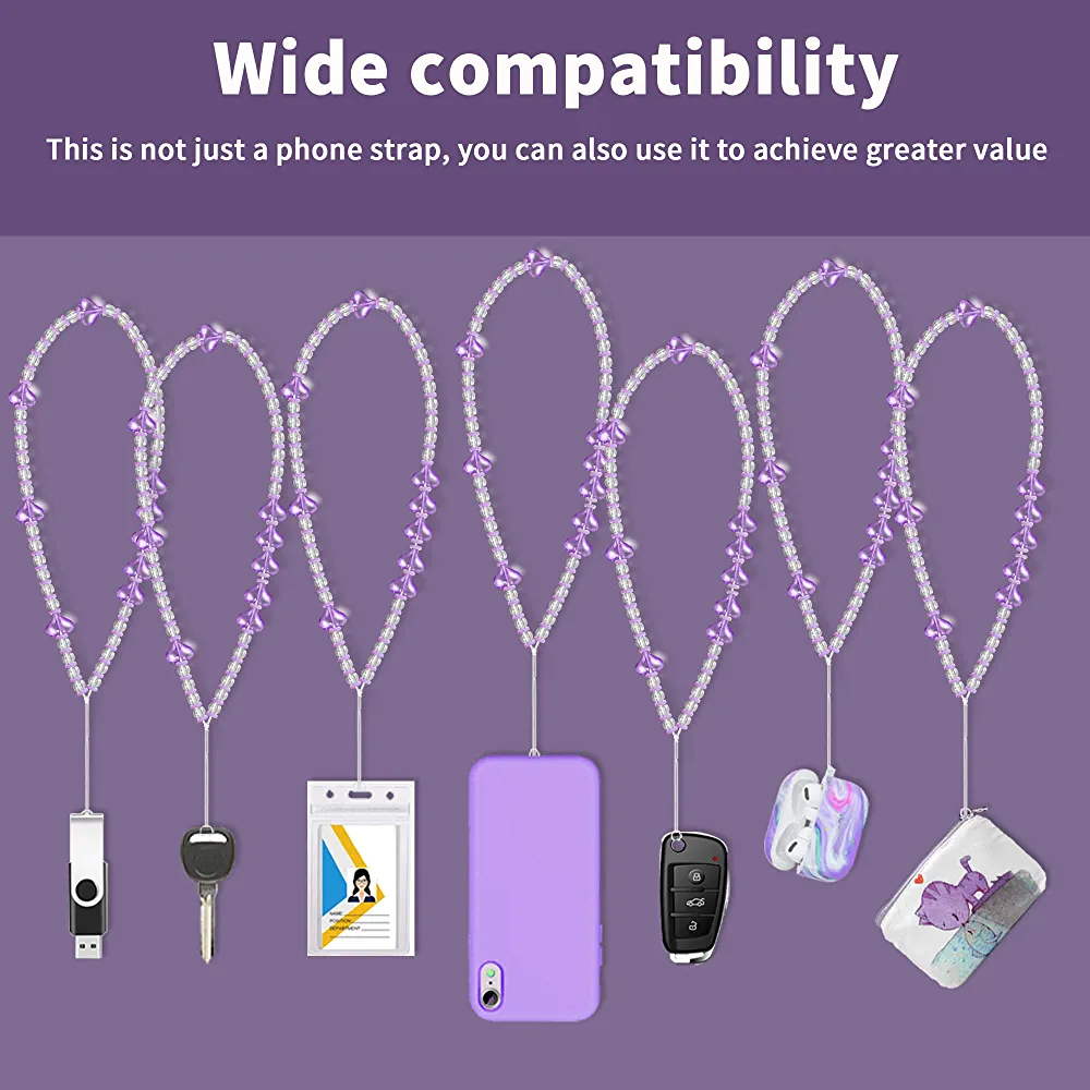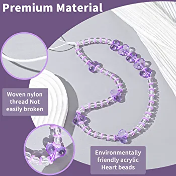 Purple Crystal Bead Phone Lanyard for Women and Girls with Heart Charm. Compatible with Smartphone and Airpod Cases.