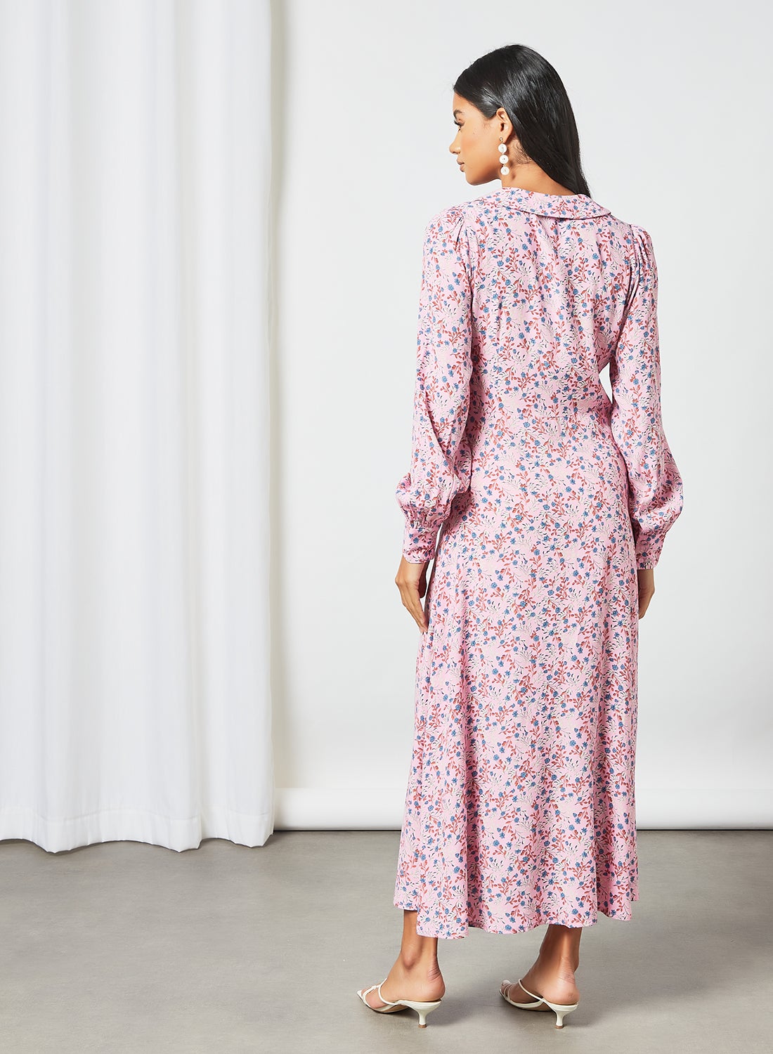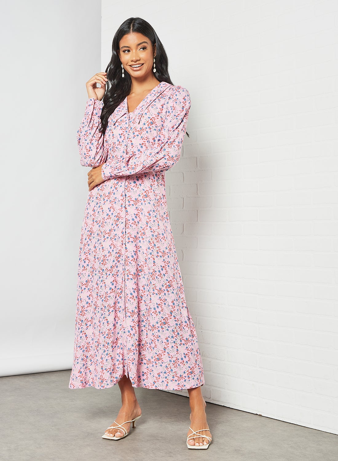 This product features a soft and airy viscose material that provides a comfortable fit. It showcases a charming ditsy floral pattern throughout the garment. The dress has a V-neckline and long sleeves, and falls to a midi length with a regular fit. Please follow the care label instructions when washing.