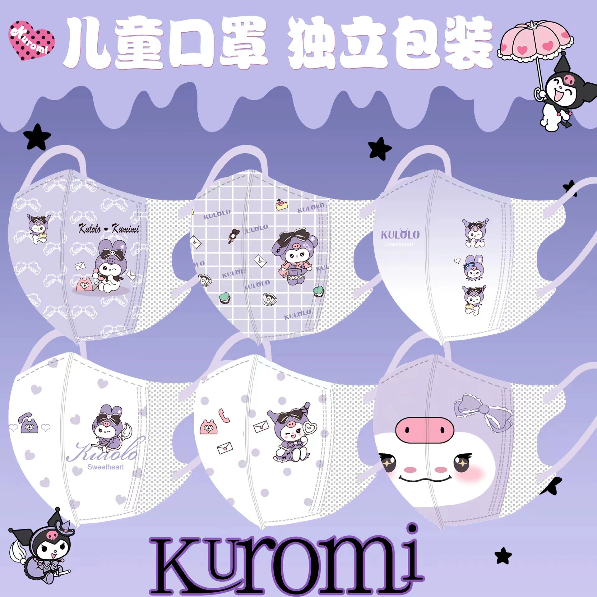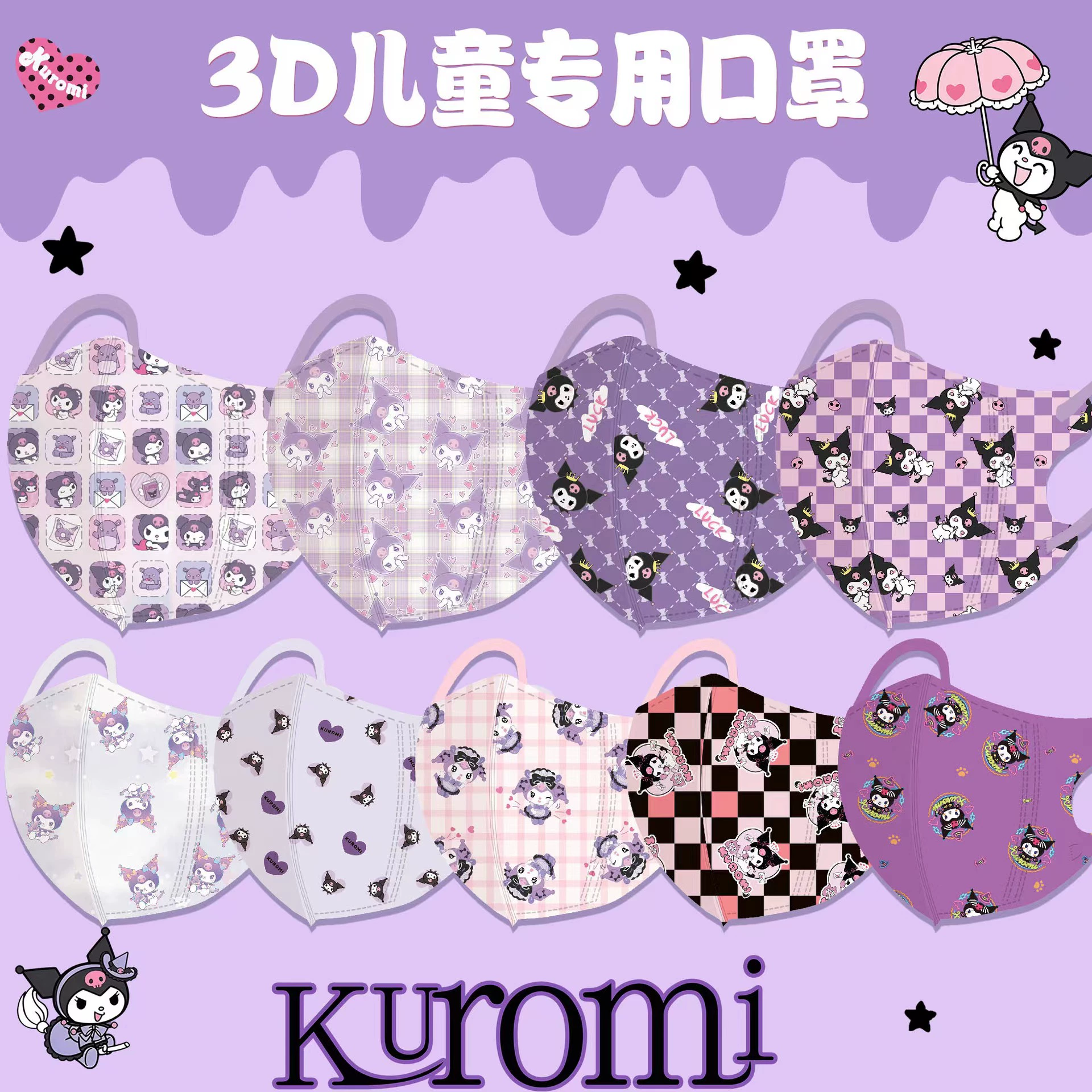 | nameOriginal | Purple Kuromi children's mask 3D three-dimensional child student special cartoon cute 3-12 year old girl mouth and earmuffs |
