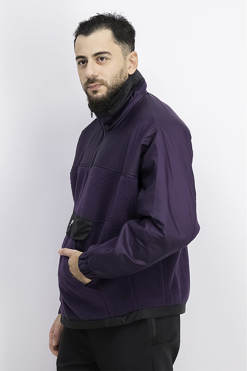 This product is easy to care for as it is machine washable. It has a regular fit and is available in international sizes. The long sleeves and medium thickness make it suitable for training. Please note that the product color may appear slightly different due to lighting or monitor settings. The jacket is made of 55% polyester and 45% recycled polyester with a textured pattern. It has a zipper closure and a mock neckline. This product belongs to the sportswear category and comes in a purple color.