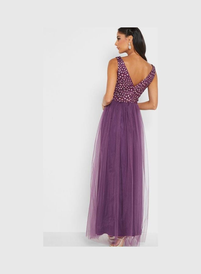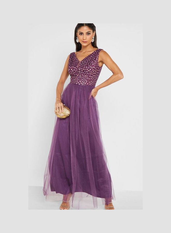 Make a statement at your upcoming special occasion with this stunning A-line dress. Crafted from textured and comfortable polyester fabric, it features eye-catching sequin embellishments on the front. The dress boasts a plunging neckline with broad shoulder straps and a concealed zipper closure at the back. The mesh maxi dress style adds a touch of elegance to the overall look.