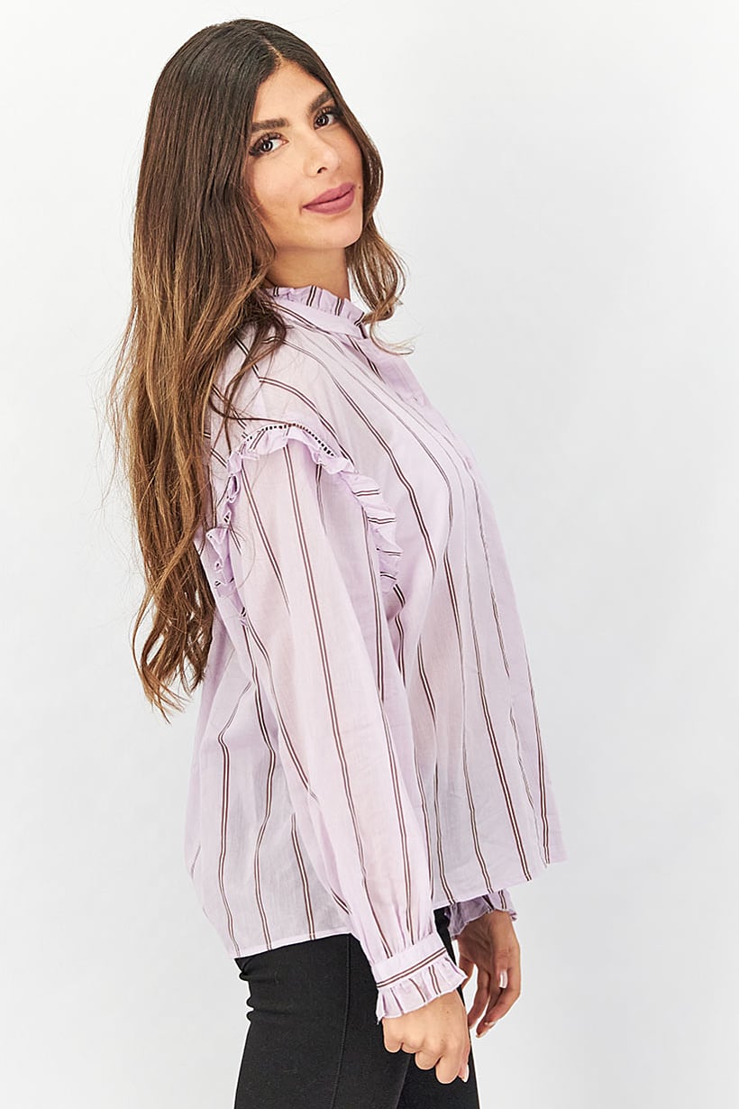 | nameOriginal | Women Ruffle Neck Long Sleeves Stripe Print Blouse, Purple |