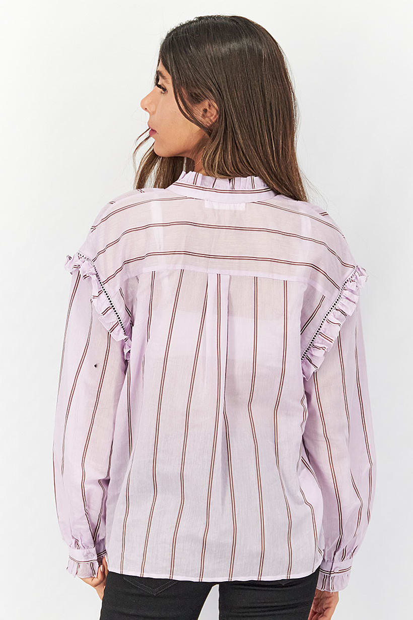 | descriptionOriginal | Care : Machine washable, Fit : Regular fit, Ideal For : Women, Size shown : US, Top Style : Blouse, Types of Hem : Straight hem, Types of Neckline & Collar : Ruffle collar, Types of Sleeve : Longsleeve, Disclaimer : Product color may slightly vary due to photographic lighting sources or your monitor settings., Fabrics : 70% Cotton, 24% Silk, 6% Viscose, Occasion : Casual, Pattern & Print : Stripe, Types of Closures : Button, Color Family : Purple, |