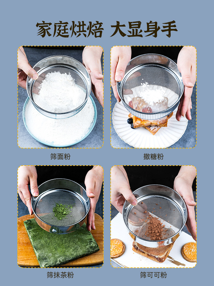 | nameOriginal | Q683 baking flour sieve 304 stainless steel flour sieve household kitchen handheld screen filter net sugar sieve |
