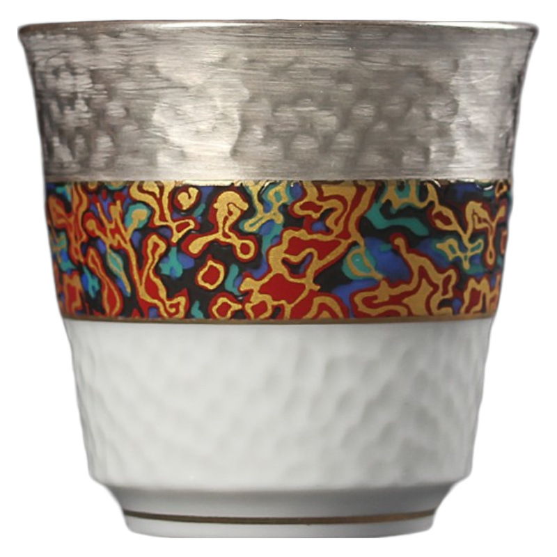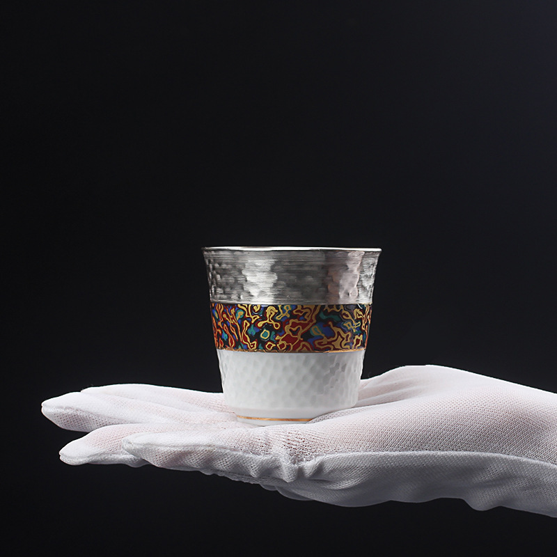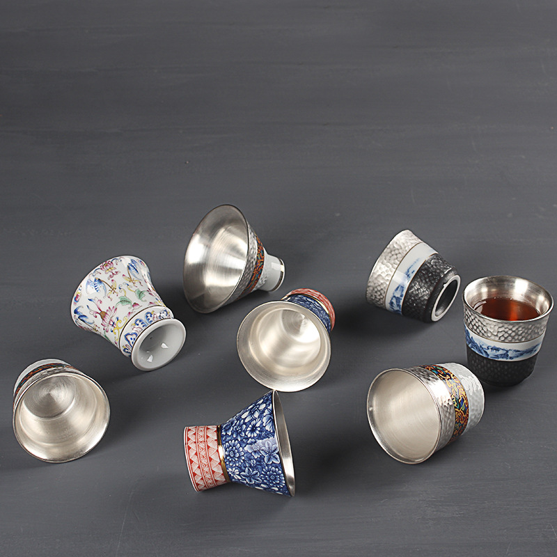 QD4D handmade 999 sterling silver tea cup blue and white porcelain liner silver inlaid kung fu tea set household silver cup