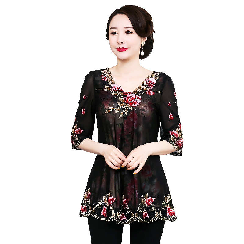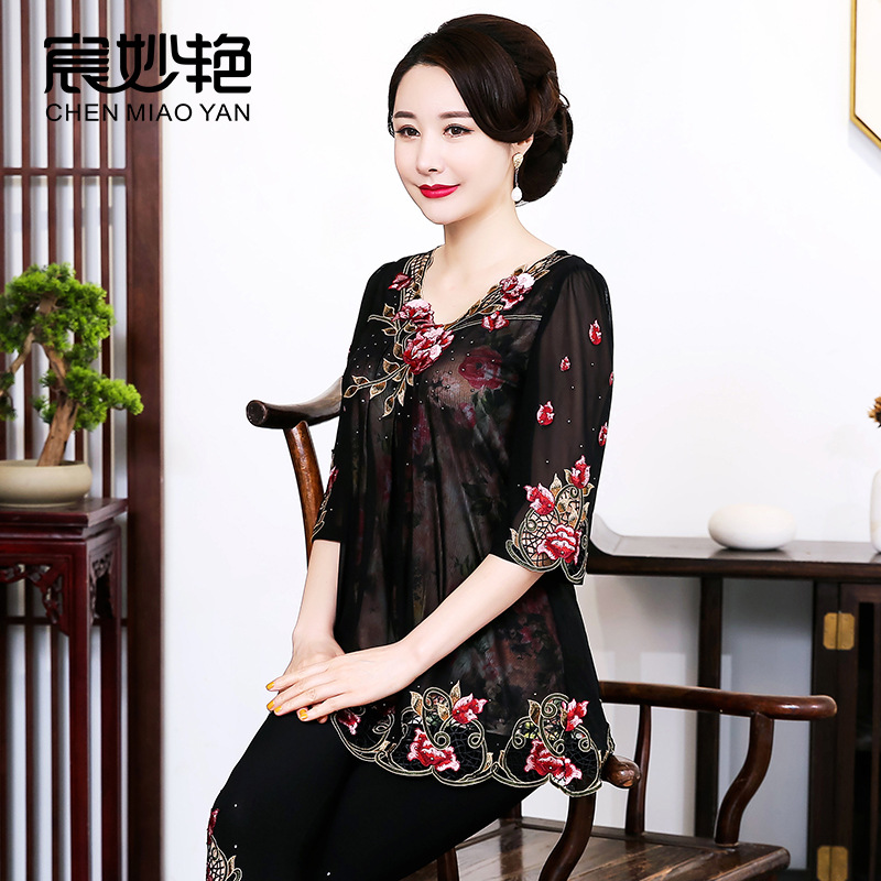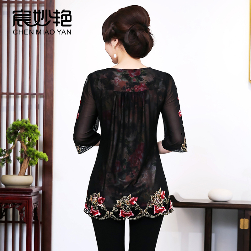 | nameOriginal | Qimiaoyan summer women's lace shirt middle-aged and elderly women's Korean-style loose top plus size mother's clothing wholesale |