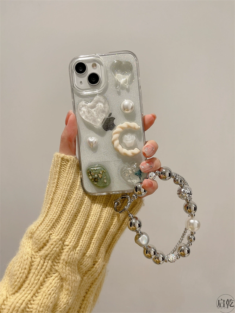 Qiqian Epoxy three-dimensional pearl love iPhone15 mobile phone case suitable for Apple 14/13 promax soft shell 12 portable 11 chain lanyard high-end niche gem new goddess temperament