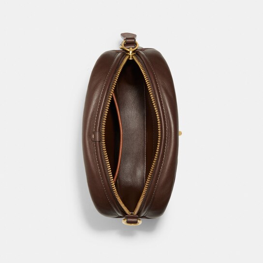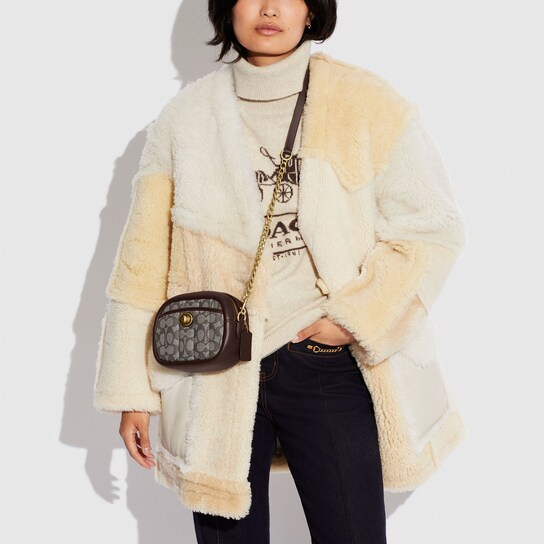 This product features a combination of signature jacquard and glovetanned leather, with a zip closure and leather lining. It includes one credit card slot, an inside multifunction pocket, and an outside turnlock pocket. The detachable strap allows for versatile wear as a shoulder or crossbody bag, with a drop of 21 1/2″. Its dimensions are 7 3/4″ in length, 5 3/4″ in height, and 2 1/2″ in width, and its style number is C5275.