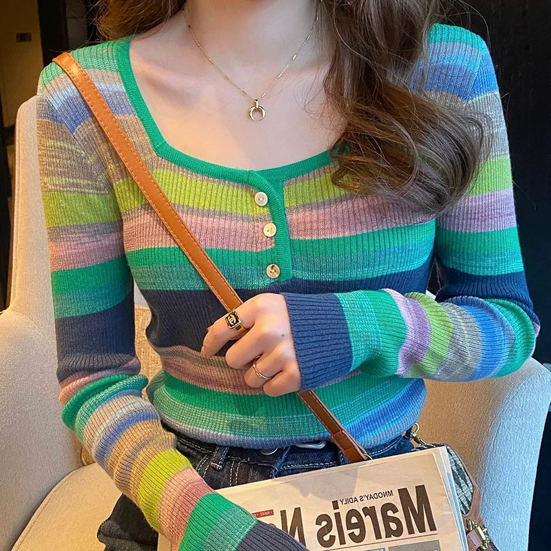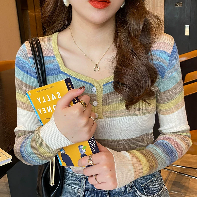 Rainbow striped knitted thin inner square neck bottoming shirt