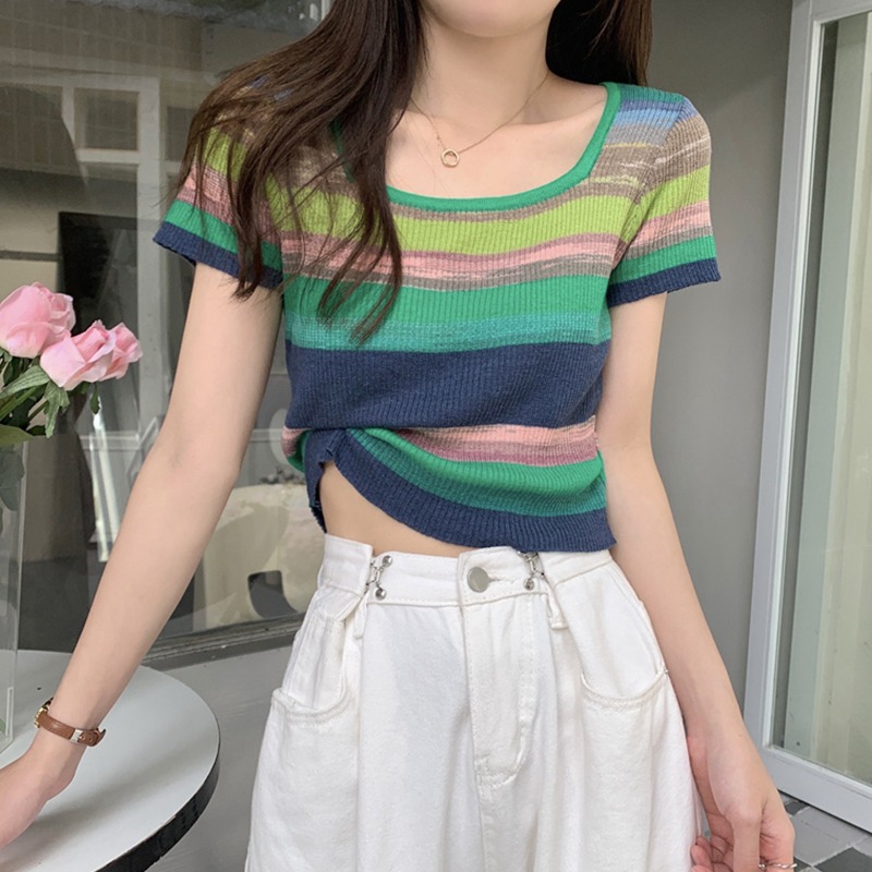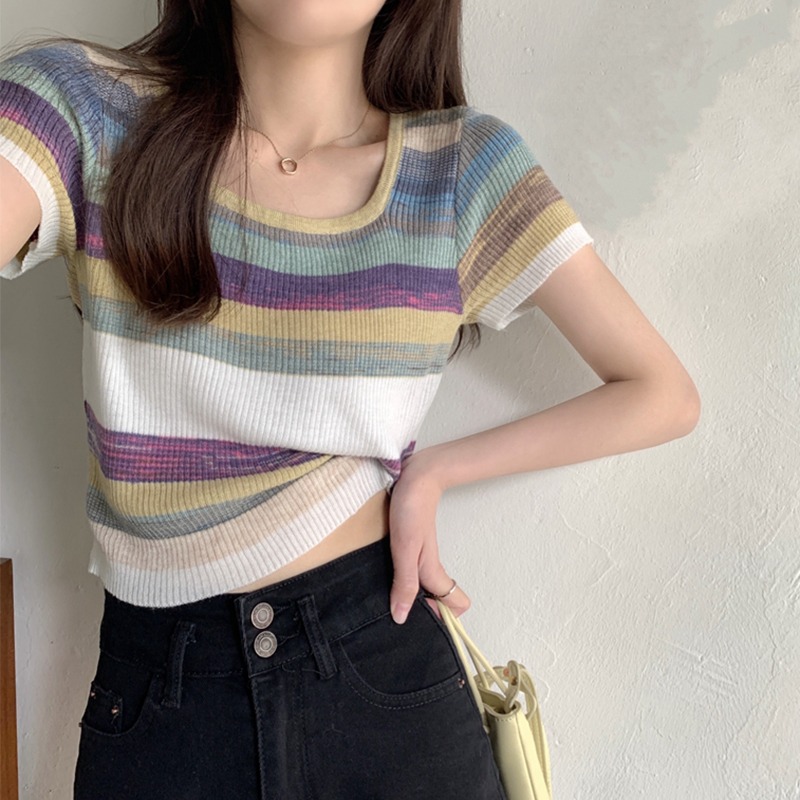 | nameOriginal | Rainbow Striped Square Neck Short Sleeve T-Shirt Women's Shoulder Summer 2024 New Thin Ice Silk Knitted Short Top |