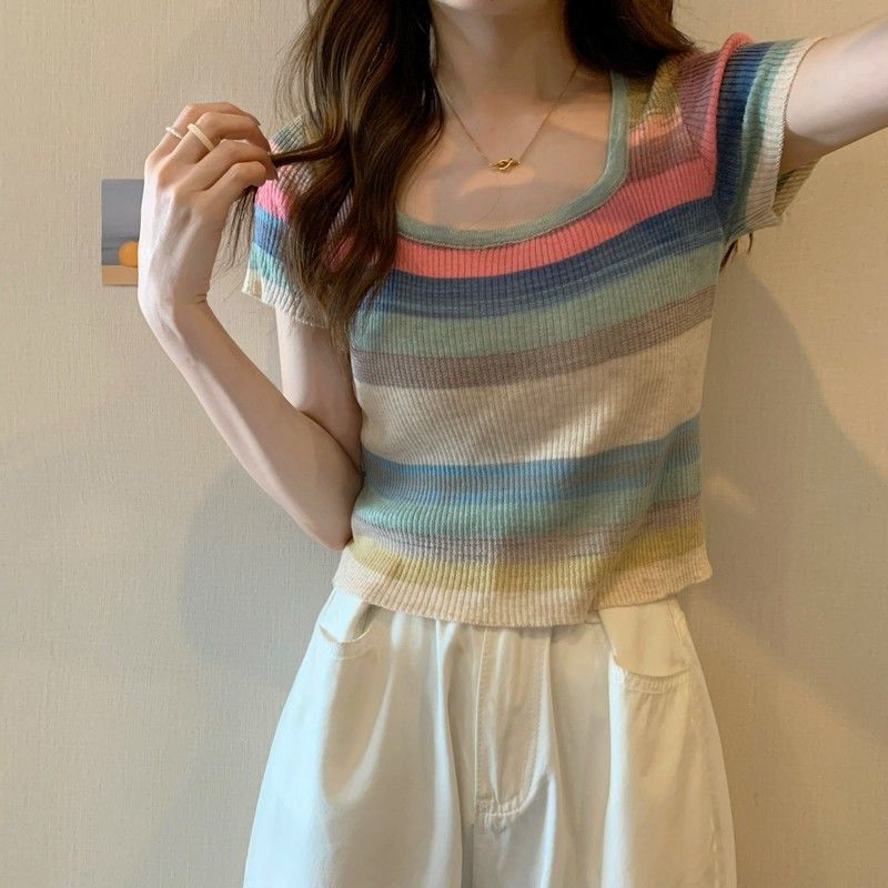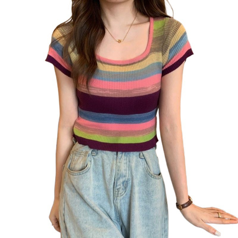 | nameOriginal | Rainbow Striped Square Neck Shoulder Knitted Short-sleeved T-shirt Women's Summer Thin Design Pure Short Sweet Hot Top Instagram |