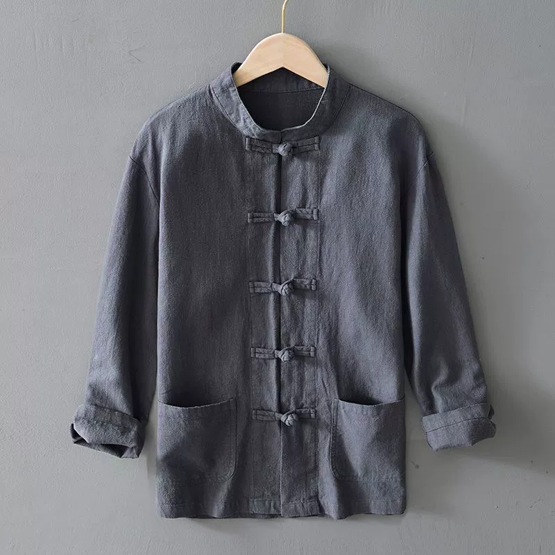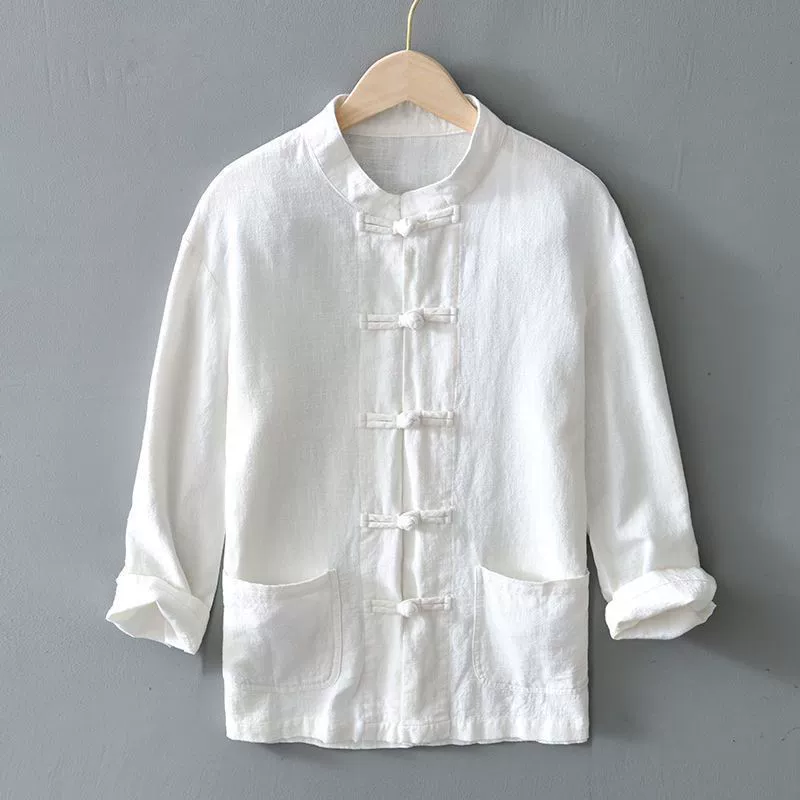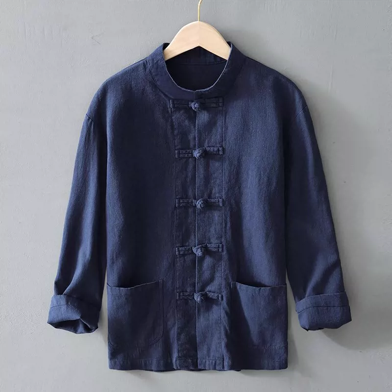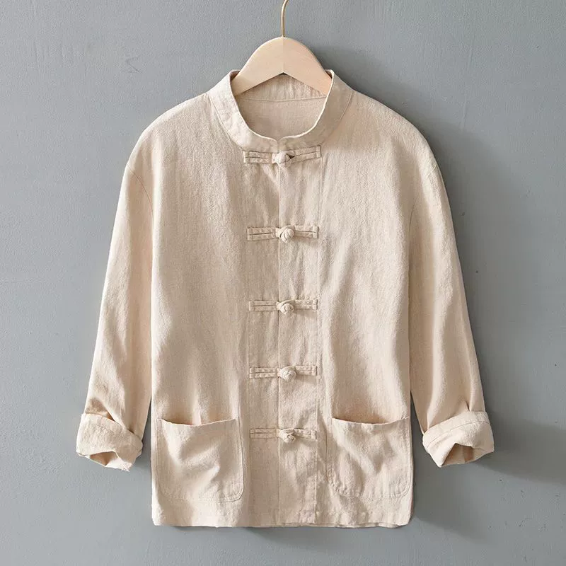 Ramie long sleeve Chinese style youth stand collar shirt with button