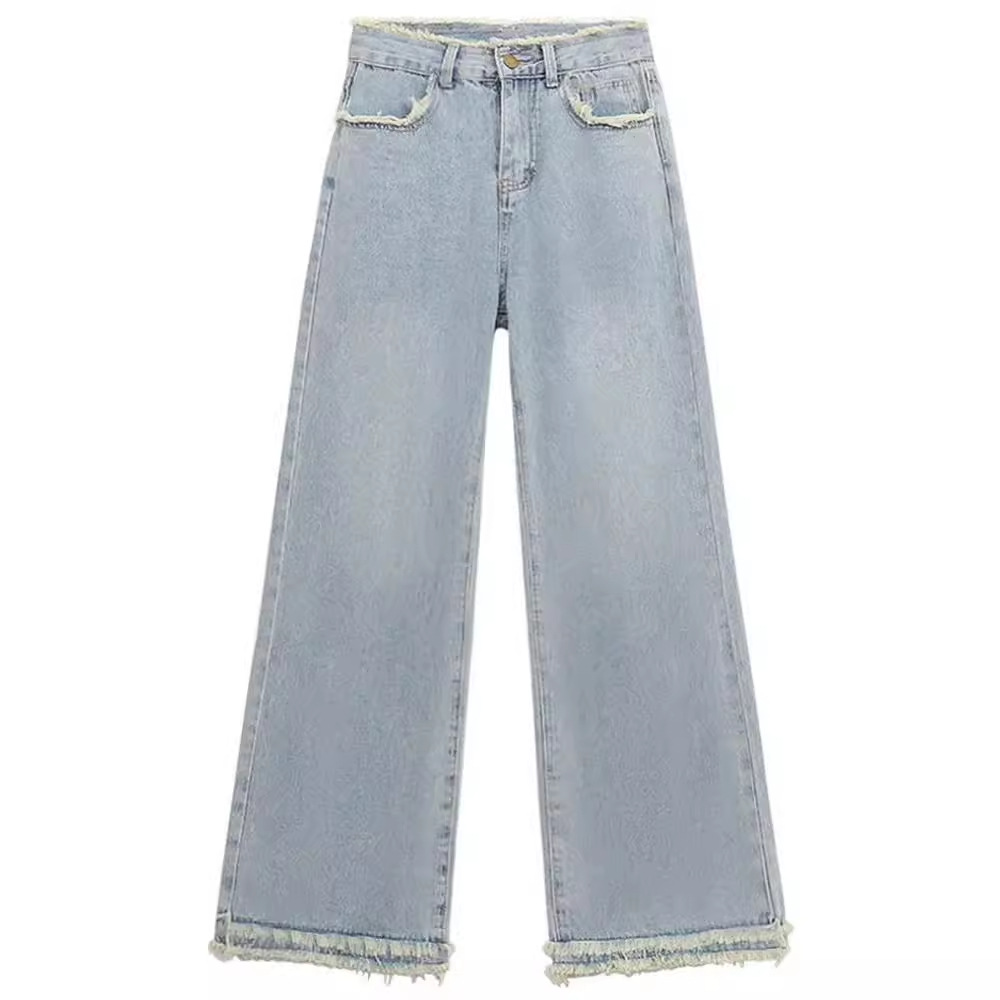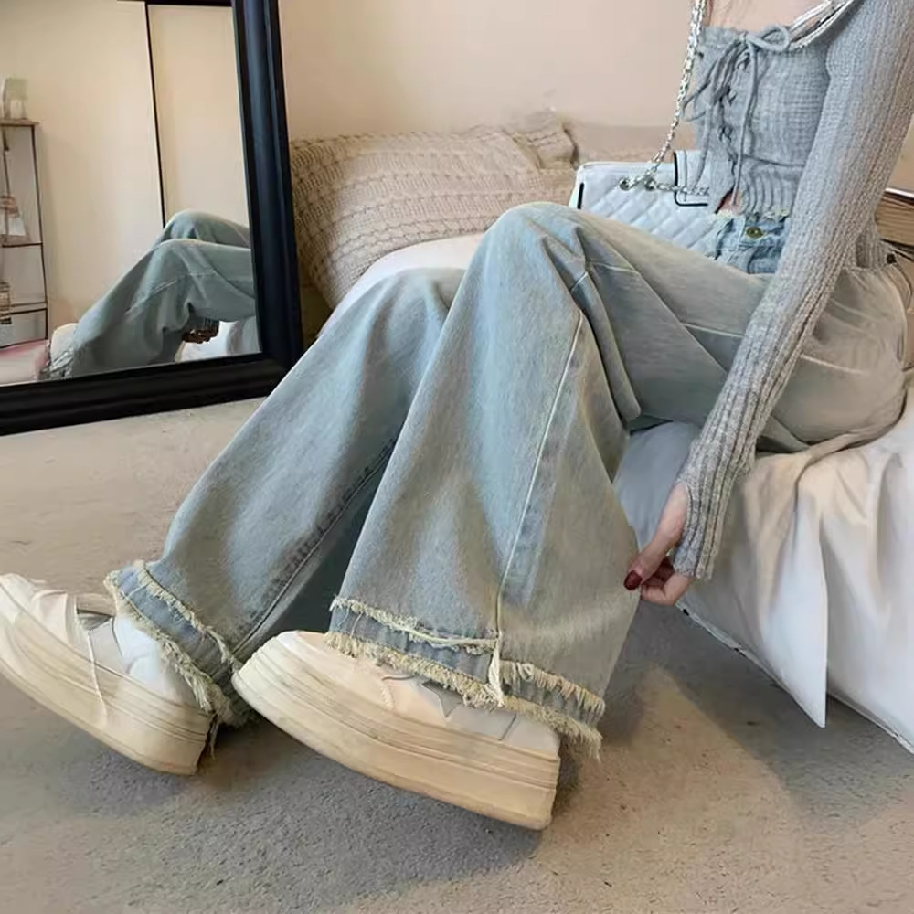 | nameOriginal | Rapped Design Light Blue Jeans Women's Autumn 2024 New Retro High Waist Slimming Wide Leg Straight Pants |