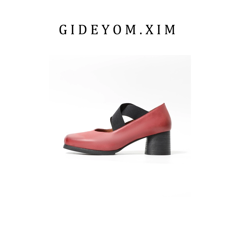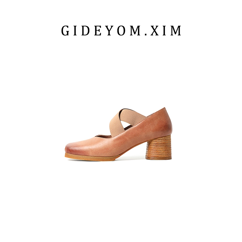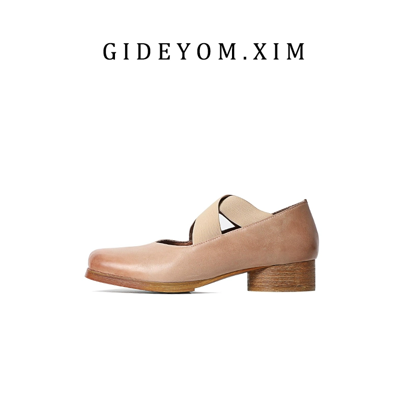 Handmade leather square head retro ballet shoes Pig nose thick heels women’s shoes wearing straps in straps, Maryzhen shoes