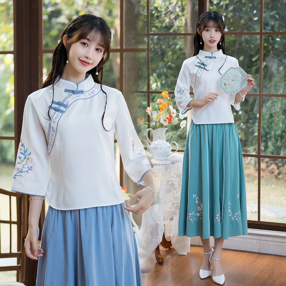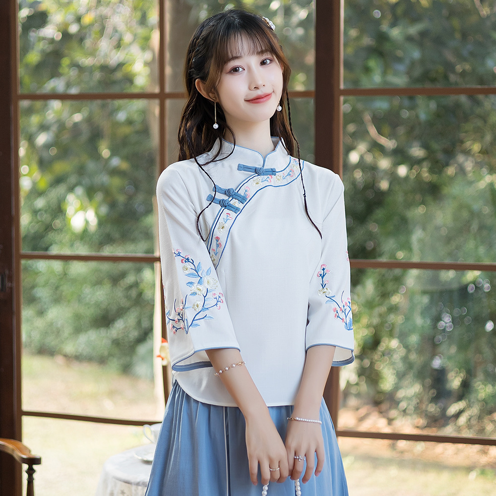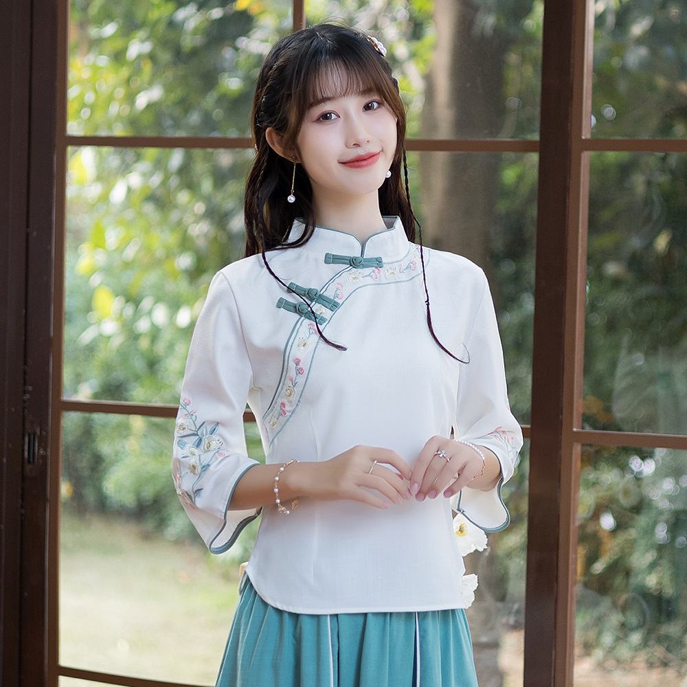 | nameOriginal | Real Shot 2022 Spring and Summer New Ethnic Style Cotton and Linen Embroidered Collar Slim-fit Retro Art Tea Top |