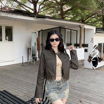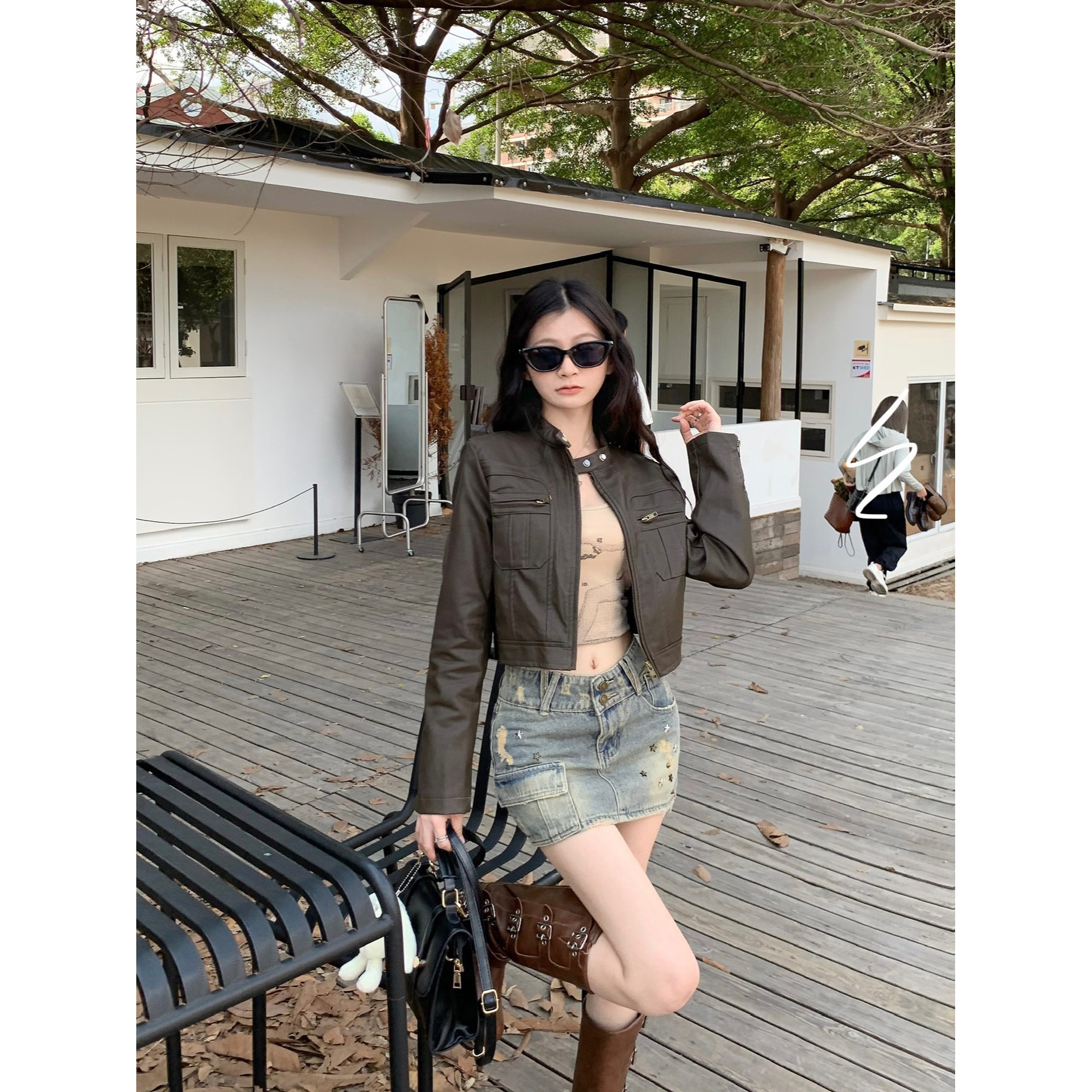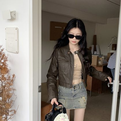 Real shot 2023 autumn retro Hong Kong style all-match short leather jacket women’s stand collar slim slimming short jacket top