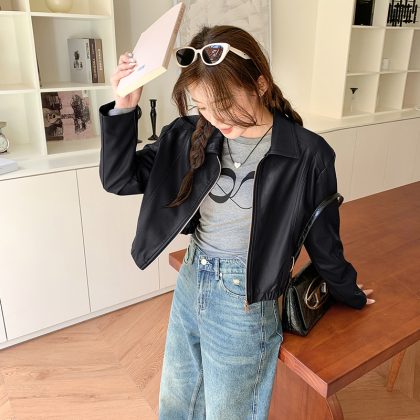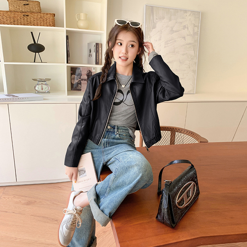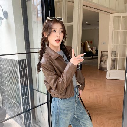 Real Shot 2023 Brown Leather Jacket Women’s Autumn Korean Sweet Cool Style Elegant Slim Lapel PU Leather Jacket Top