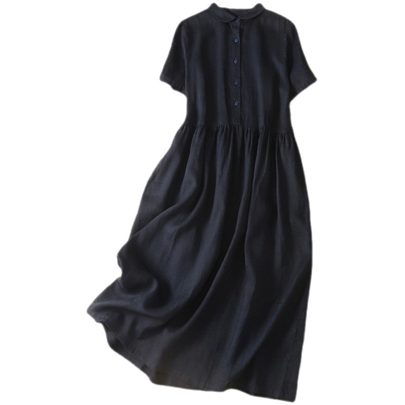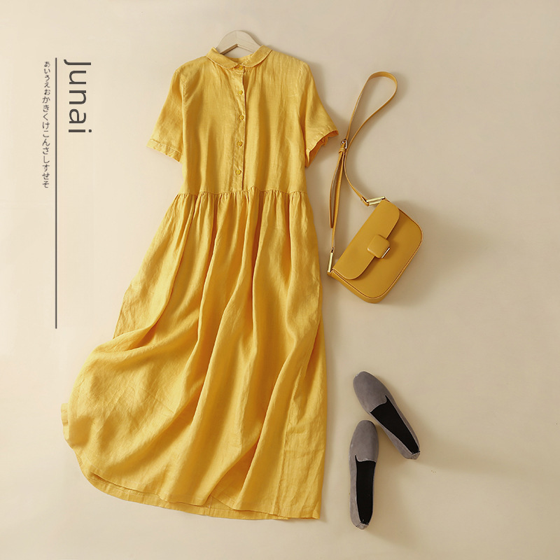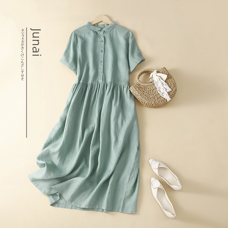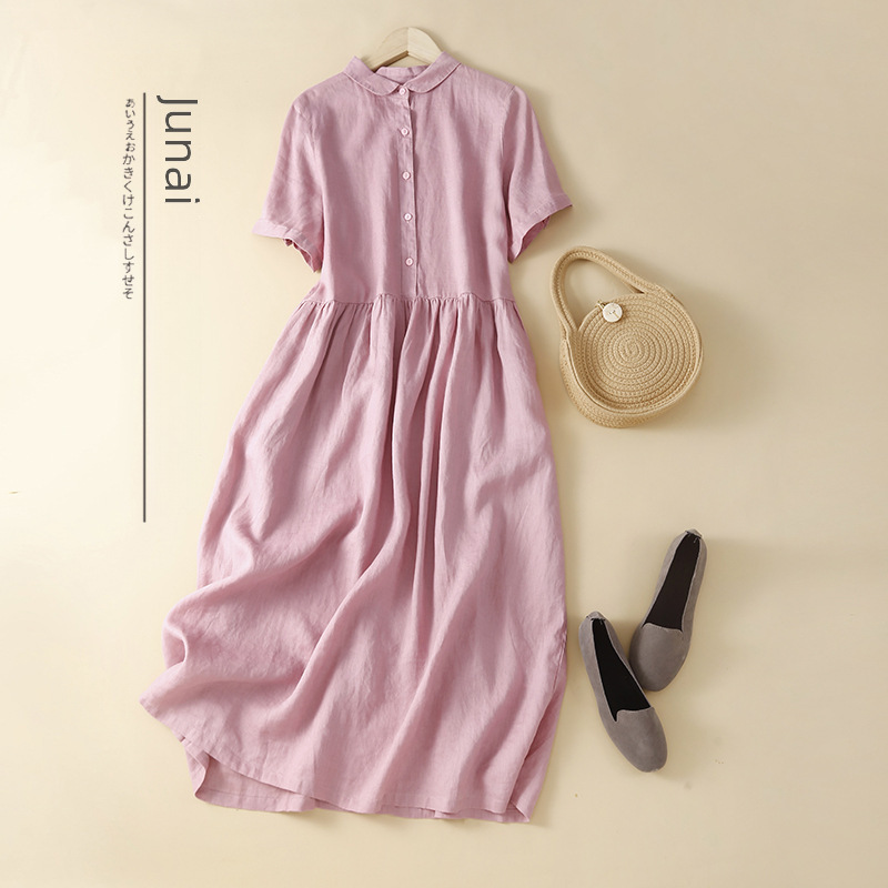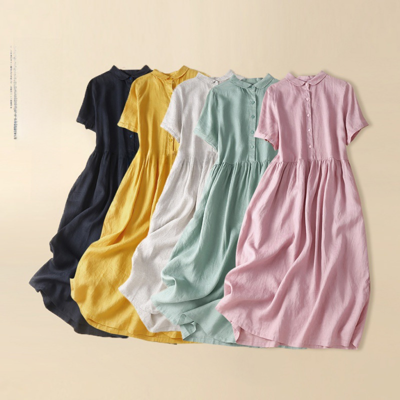 | nameOriginal | Real shot 2023 Summer new literary loose stitching solid color cotton and linen short sleeve dress women's long shirt dress |