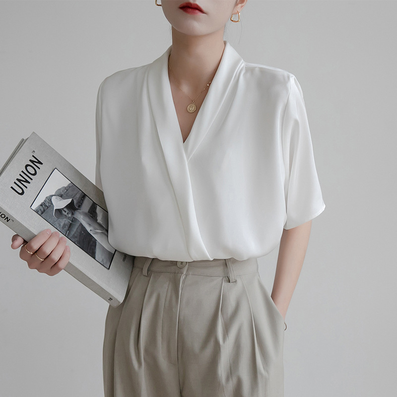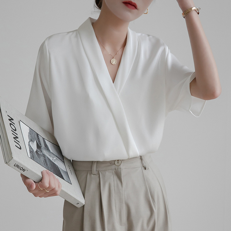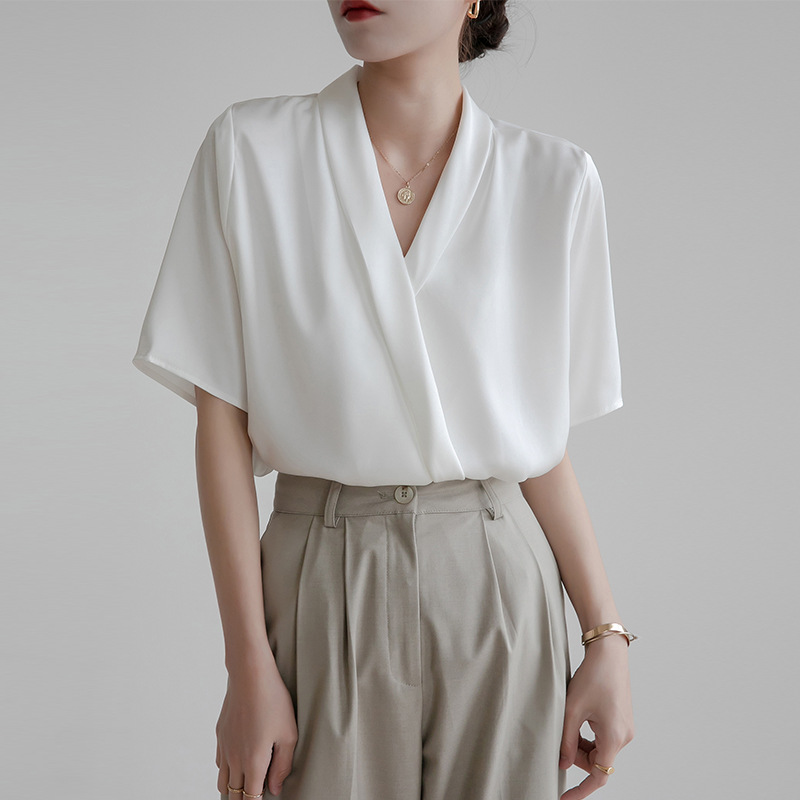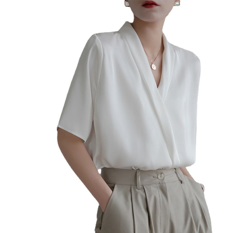 | nameOriginal | Real Shot 2023 Summer V-neck Short-sleeved White Shirt Women's Satin Design Sense Niche Light Mature French Gentle Style Women |