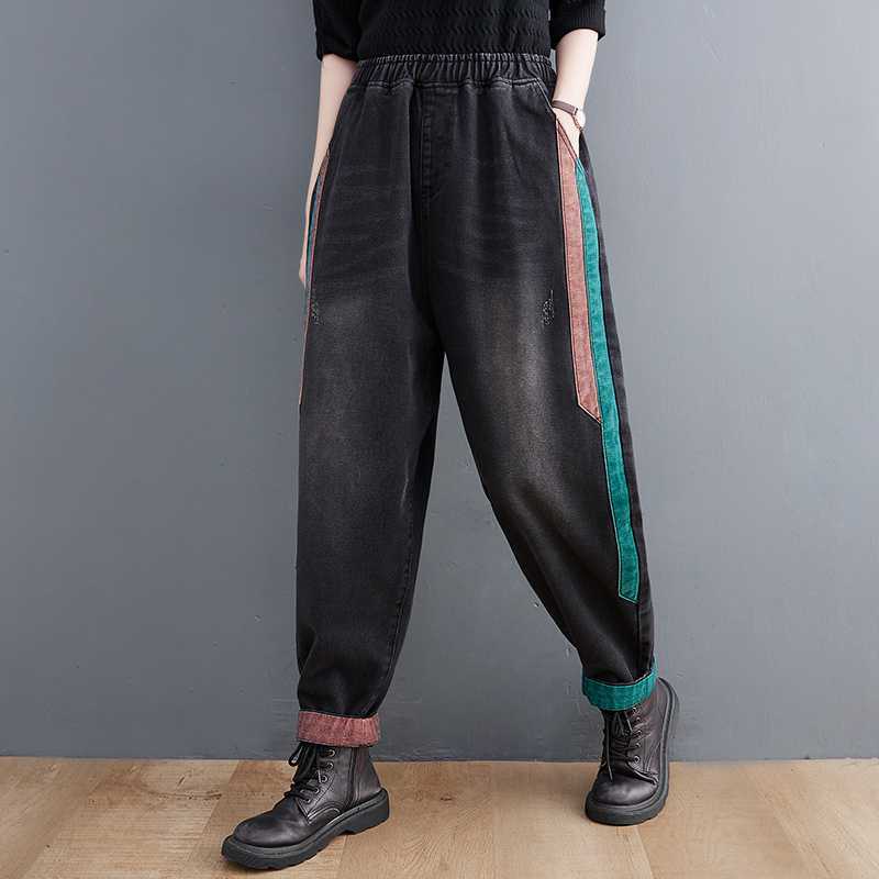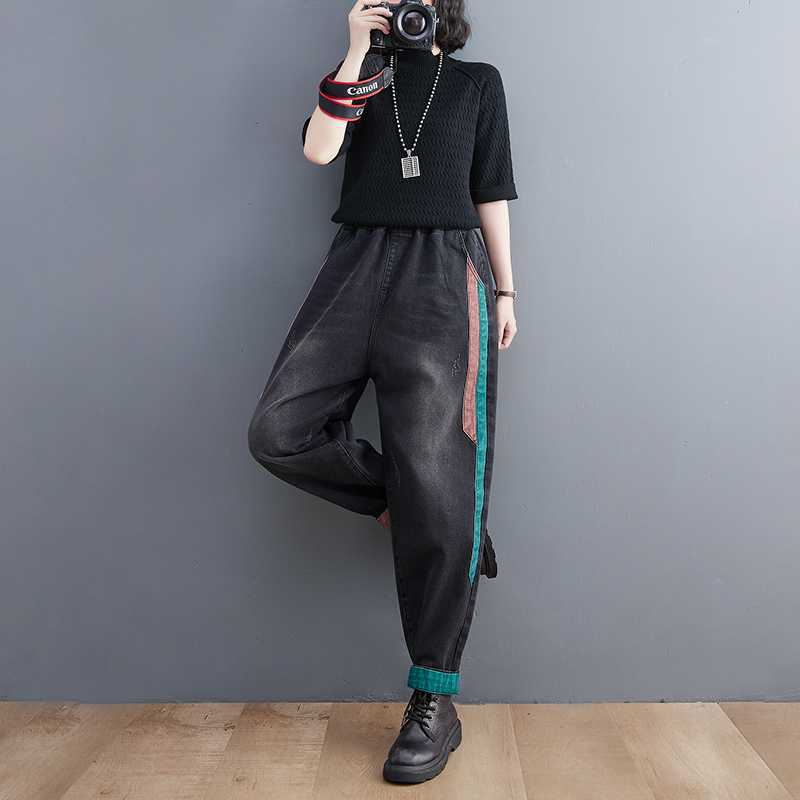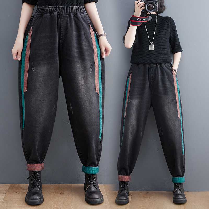 | nameOriginal | Real shot 2024 autumn new elastic waist slimming Denim baggy pants printed stitching Joker casual harem pants |