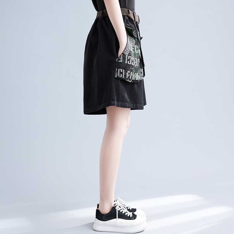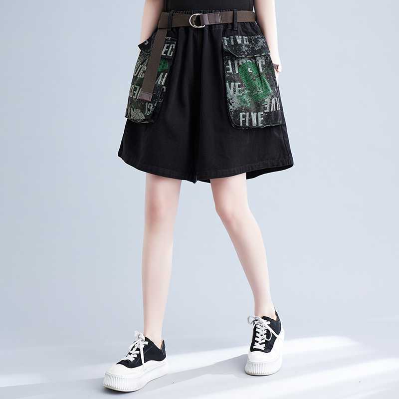 Real shot 2024 Joker Artistic Large Pocket Slimming chubby girl plus size Casual Belt Denim Shorts Wide Leg Pants