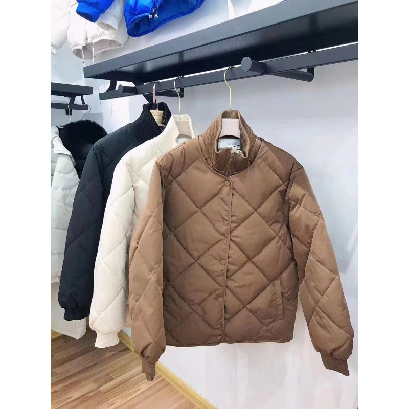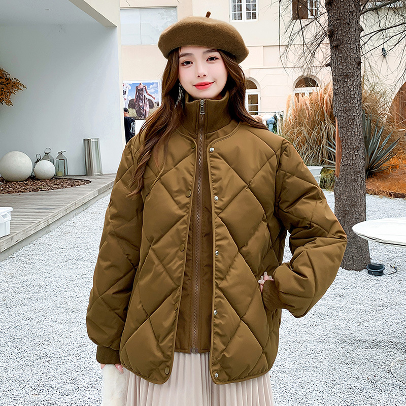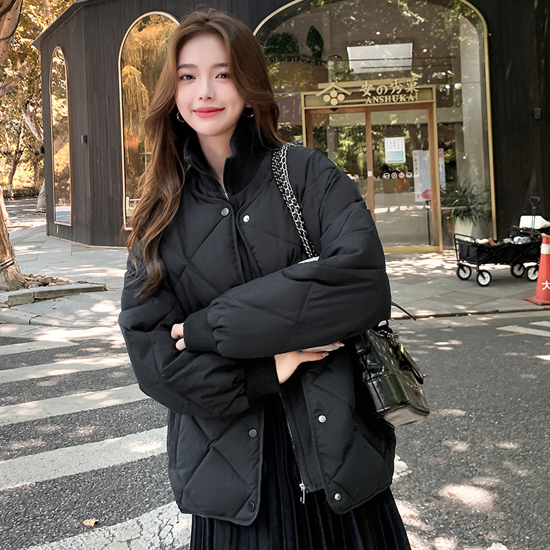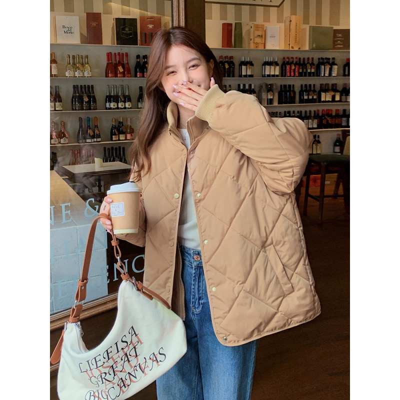 Real shot 2024 Korean style rhombus stitching down cotton-padded jacket small short warm lightweight casual stand collar coat for women