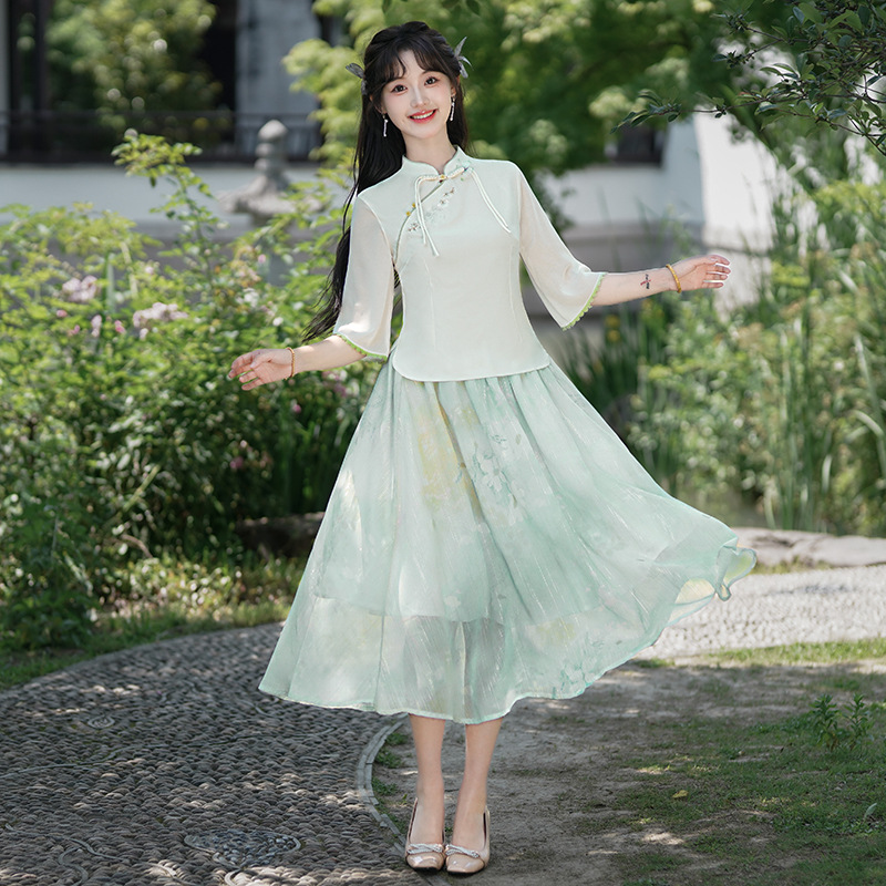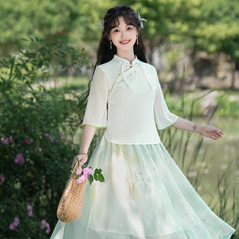 | nameOriginal | Real shot 2024 new Chinese style retro modified cheongsam embroidered top short sleeve skirt suit |
